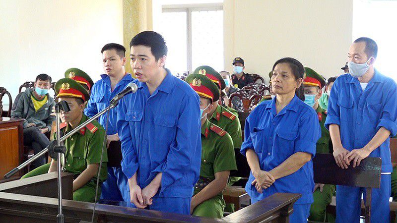 Cường cùng các đồng phạm tại tòa. (Ảnh: Báo Pháp luật Việt Nam)