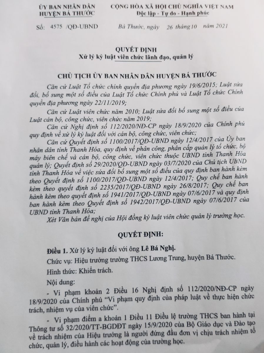 Theo đó: Ngày 26/10/2021, ông Võ Minh Khoa – Chủ tịch UBND huyện Bá Thước đã ký Quyết định số 4575/QĐ-UBND về việc xử lý kỷ luật viên chức lãnh đạo quản lý. Theo quyết định này, ông Lê Bá Nghị, Hiệu trưởng Trường THCS Lương Trung, huyện Bá Thước, tỉnh Thanh Hoá đã bị xử lý kỷ luật bằng hình thức khiển trách.