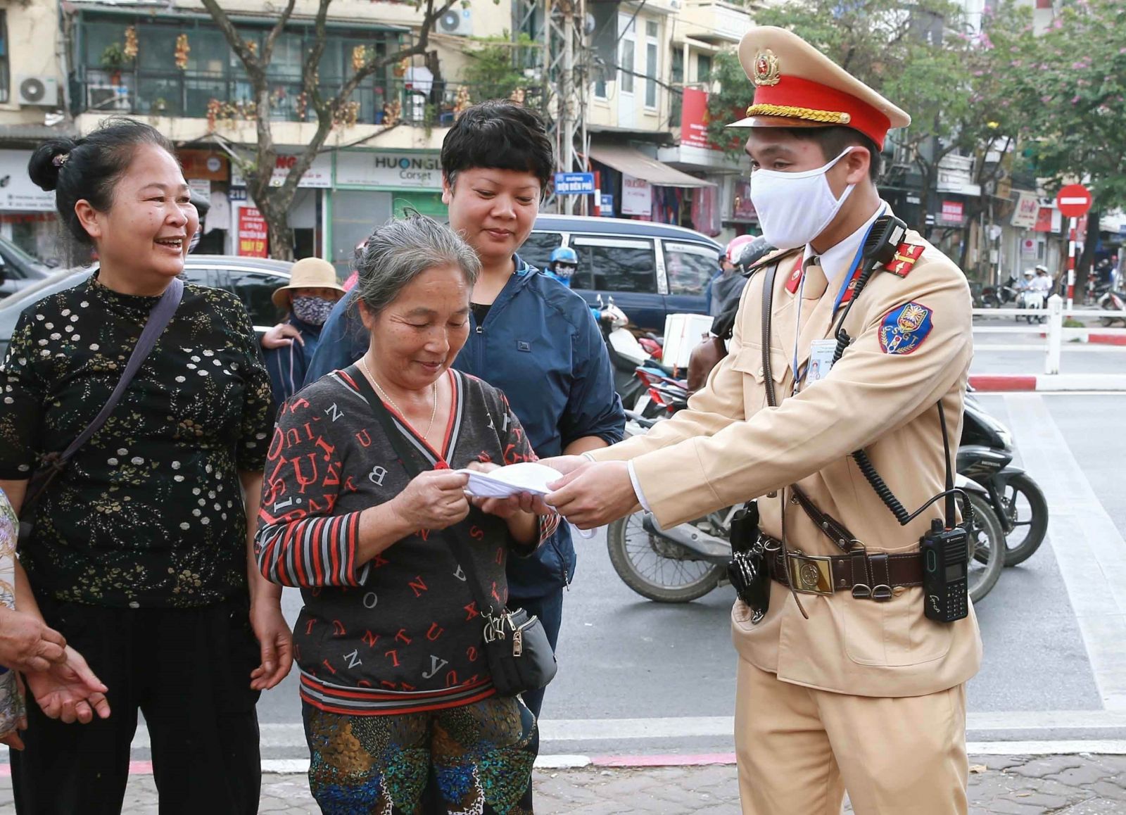 Cán bộ, chiến sĩ công an nhân dân phát khẩu trang phòng, chống dịch COVID-19 cho nhân dân_Ảnh: TTXVN