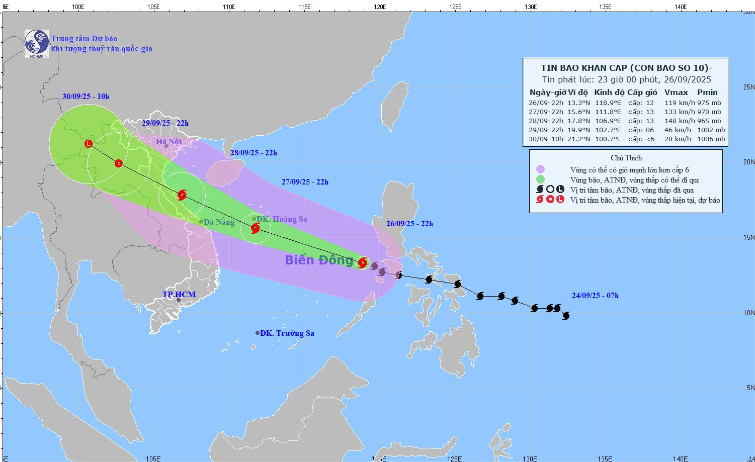 Theo dự báo của Trung tâm dự báo khí tượng thủy văn quốc gia, trong 02 ngày tới bão số 10 sẽ tiếp tục mạnh thêm lên cấp 12-13, giật cấp 16, di chuyển rất nhanh về phía vùng biển và đất liền khu vực Bắc Trung Bộ và Bắc Bộ nước ta, càng vào gần bờ biển nước ta bão càng mạnh lên. Do ảnh hưởng của bão, tại vùng biển từ Thanh Hóa đến Quảng Ngãi từ chiều tối ngày 27 tháng 9 gió sẽ mạnh dần lên cấp 6-7, sau tăng lên cấp 8-9, vùng gần tâm bão cấp 10-13, giật cấp 16, sóng biển cao 5-7m, biển động dữ dội.