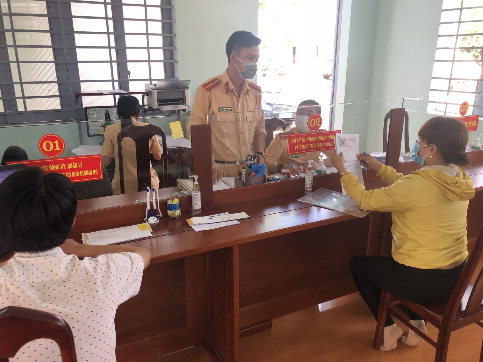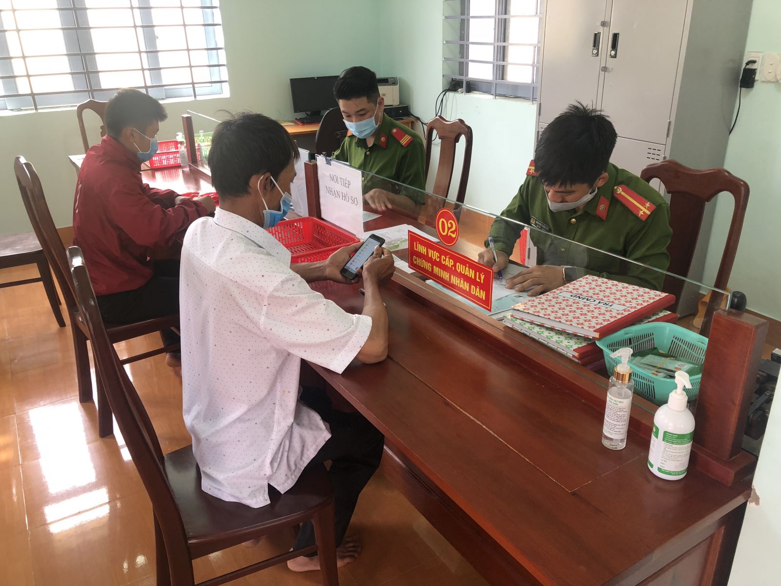 Cùng với việc trang bị các thiết bị và ứng dụng công nghệ thông tin để rút ngắn thời gian xử lý thủ tục hành chính, nhà làm việc Bộ phận một cửa được sắp xếp gọn gàng, ngăn nắp, sạch sẽ; bảng niêm yết thủ tục hành chính được bố trí khoa học, thẩm mỹ; lắp đặt hệ thống máy vi tính, mạng wifi, camera để theo dõi giám sát và bố trí hòm thư góp ý, phiếu đánh giá nhận xét về mức độ hài lòng của người dân đến giải quyết công việc… Đặc biệt trong thời gian này, để góp phần làm tốt công tác phòng, chống dịch bệnh Covid-19, Công an các huyện, thành phố triển khai thực hiện tốt các biện pháp phòng, chống dịch bệnh như: Bố trí CBCS trực tiếp tiếp xúc giải quyết công việc với người dân phải đeo khẩu trang, bố trí xà phòng, chai nước sát khuẩn để người dân rửa tay cũng như khuyến cáo người dân đến giải quyết công việc phải đeo khẩu trang...