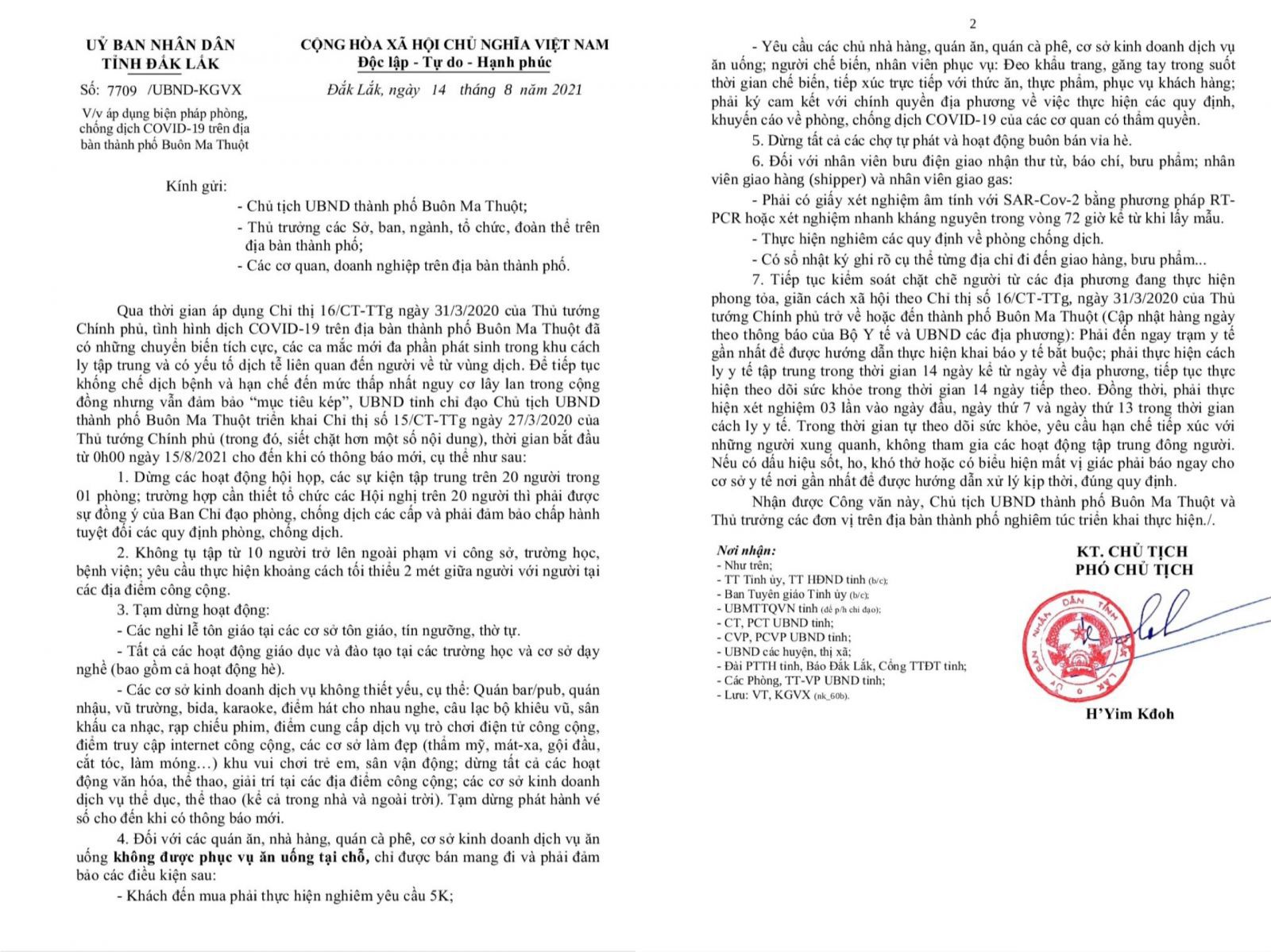 UBND tỉnh có công văn Số 7709/UBND-KGVX ngày 14 tháng 8 năm 2021, chỉ đạo Chủ tịch UBND Tp. Buôn Ma Thuột, Thủ trưởng các Sở, Ngành, tổ chức, đoàn thể, các cơ quan, doanh nghiệp trên địa bàn Thành phố triển khai Chỉ thị Số 15 của Thủ tướng Chính phủ.