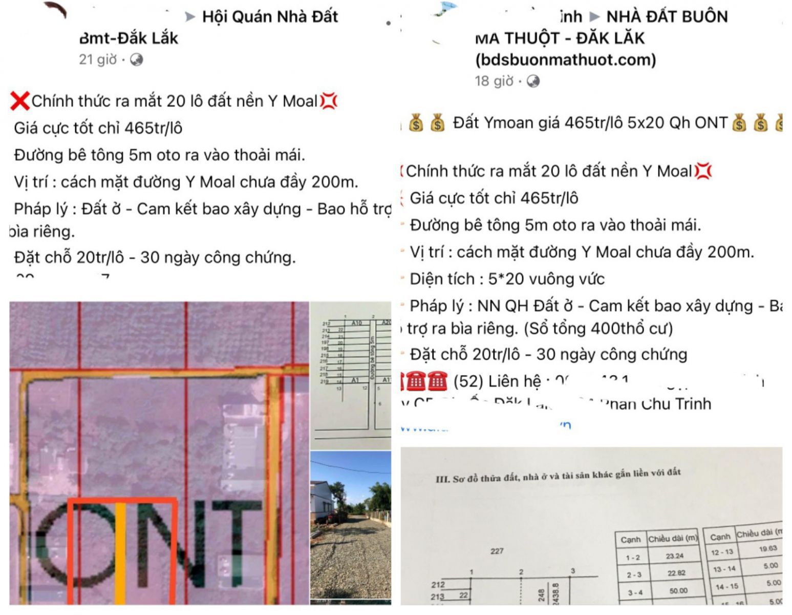 Cụ thể: tại Buôn Dhăp rông xã Cư Êbur, mảnh đất do bà Đ.T.H (sn 1981) làm chủ sở hữu quyền sử dụng đất có dấu hiệu tự ý mở đường để phân lô bán nền. Theo tìm hiểu, vị trí đất thuộc thửa số 238 và 246, sau đó hợp lại thành thửa số 248 tờ bản đồ số 60, với diện tích 2438,8m2, được rải đá dăm nước và đang rao bán trên mạng xã hội với nội dung cam kết tách bìa riêng, chuyển đổi mục đích sử dụng đất cho người mua. “Chính thức ra mắt 20 lô đất nền YMoan, Giá cực tốt chỉ 465tr/lô. Đường bê tông 5m oto ra vào thoải mái. Pháp lý: Đất ở - Cam kết bao xây dựng – Bao hỗ trợ ra bìa riêng. Đặt chỗ 20tr/lô – 30 ngày công chứng…”