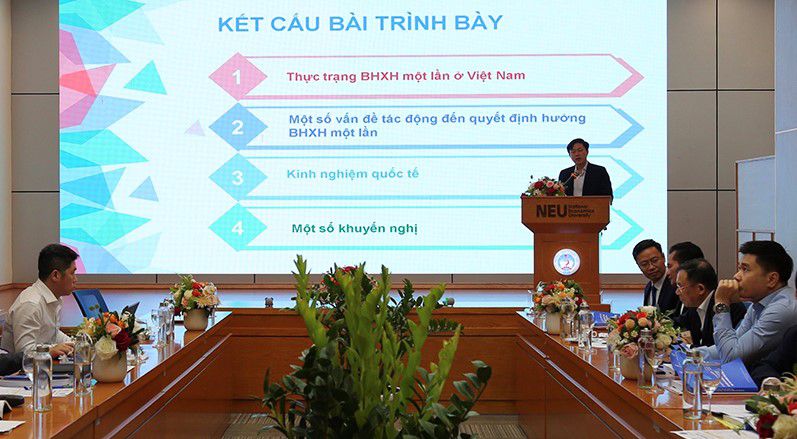 Phó Vụ trưởng Trần Hải Nam trình bày thực trạng và các khuyến nghị về chính sách BHXH một lần tại hội thảo khoa học. Ảnh: TÂM TRUNG