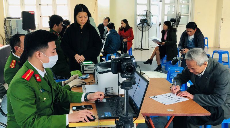 Công dân phường Thanh Xuân Trung (quận Thanh Xuân) thực hiện các thủ tục để cấp căn cước công dân gắn chíp điện tử. Ảnh: Thái San