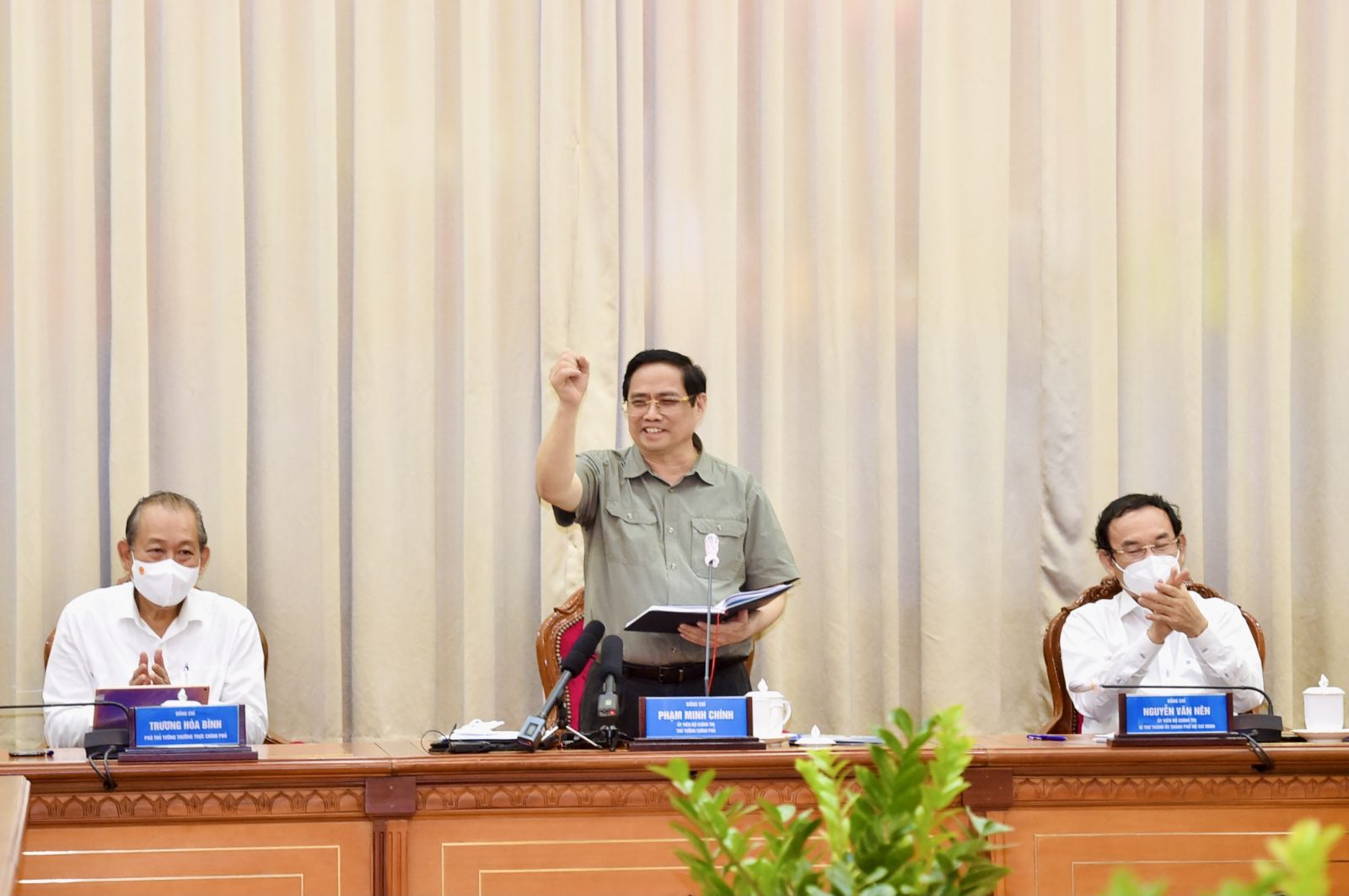 Thủ tướng và các thành viên đoàn công tác, lãnh đạo TP Hồ Chí Minh tại cuộc họp đồng lòng nhất trí khẳng định quyết tâm kiềm chế, ngăn chặn và đẩy lùi dịch bệnh, vì “cả nước đang hy vọng, đang trông đợi, đang tin tưởng vào TP Hồ Chí Minh”.