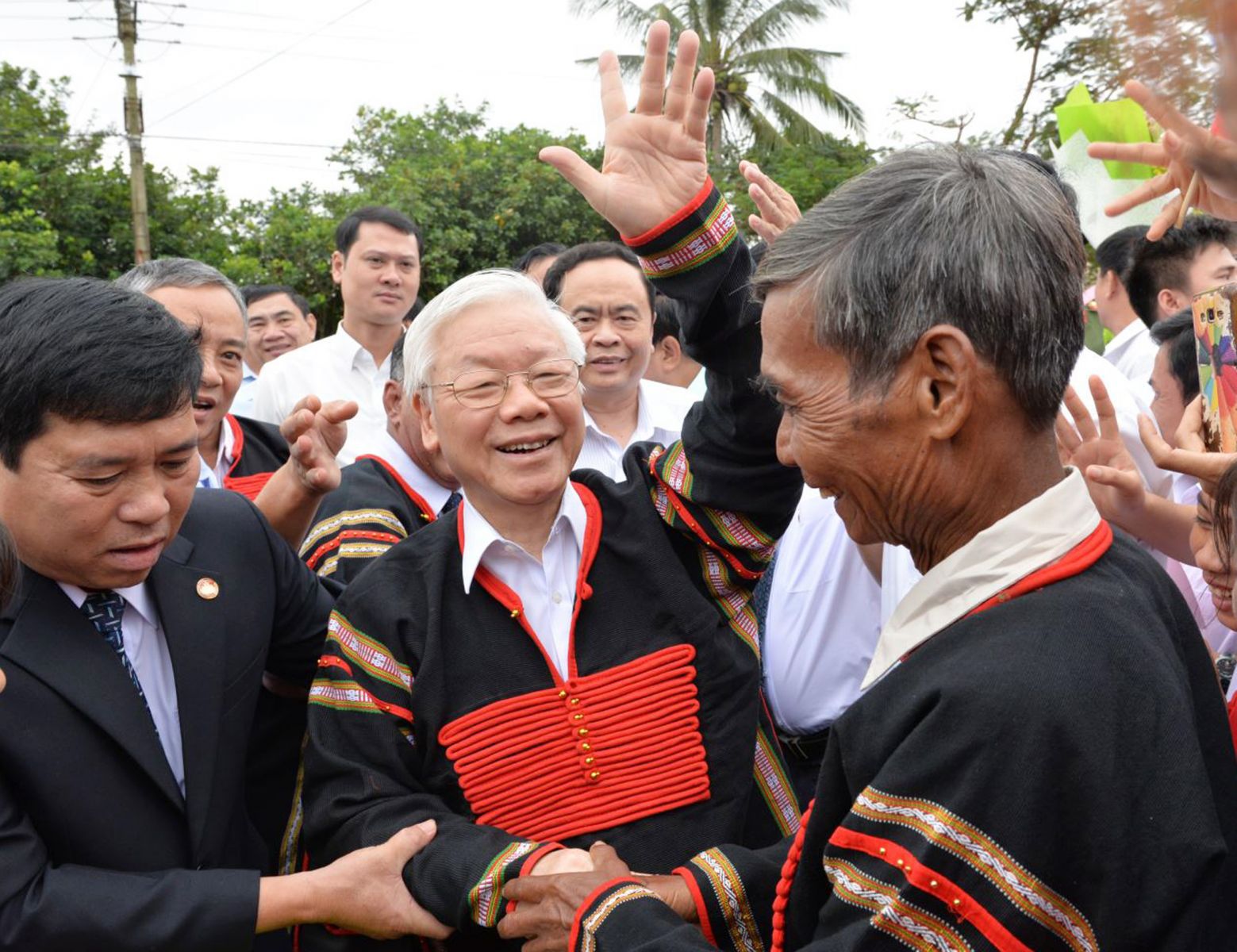 Tổng Bí thư, Chủ tịch nước Nguyễn Phú Trọng dự Ngày hội Đại đoàn kết toàn dân tộc tại xã Dur Kmăl, huyện Krông Ana, tỉnh Đắk Lắk, năm 2018 _Ảnh: TTXVN