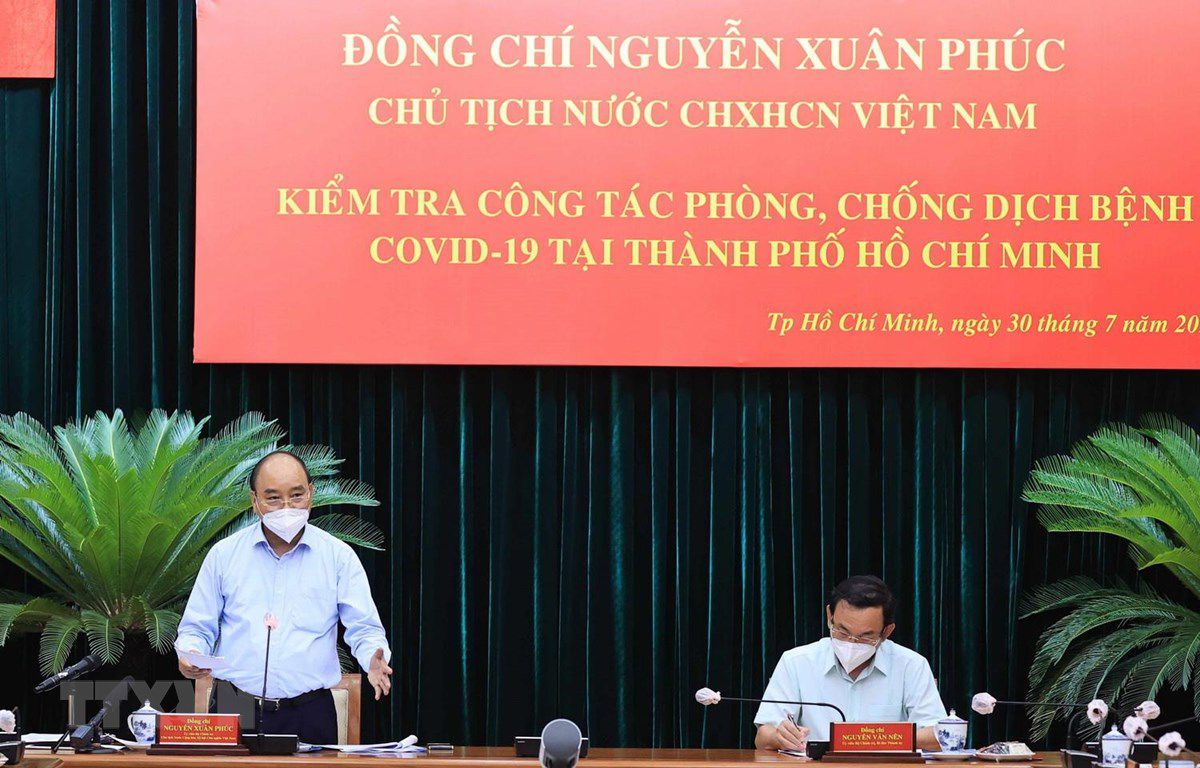 Tiếp tục chuyến công tác tại vùng tâm dịch COVID-19, ngày 30/7, Chủ tịch nước Nguyễn Xuân Phúc làm việc với lãnh đạo chủ chốt Thành phố Hồ Chí Minh. Dự buổi làm việc có Ủy viên Bộ Chính trị, Bí thư Thành ủy Nguyễn Văn Nên và lãnh đạo một số bộ, ngành.