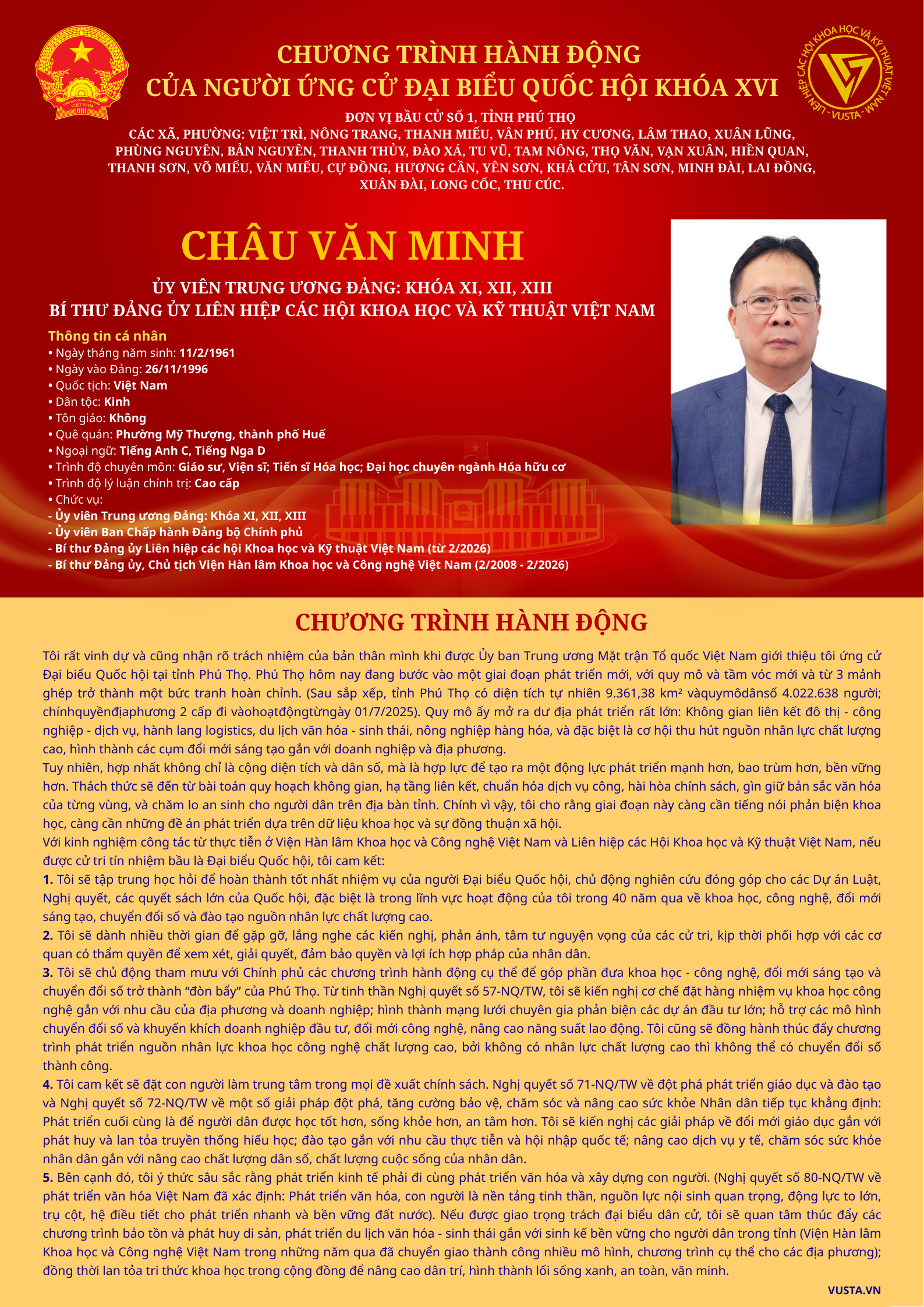 Đến nay, các ứng cử viên đã xây dựng chương trình hành động cụ thể, thiết thực, sẵn sàng bắt tay ngay vào thực hiện trọng trách của người đại biểu dân cử khi được tín nhiệm. Trang tin Vusta.vn trân trọng giới thiệu Chương trình hành động của GS.VS. Châu Văn Minh - Bí thư Đảng ủy Liên hiệp các Hội Khoa học và Kỹ thuật Việt Nam (VUSTA), hiện là ứng cử viên đại biểu Quốc hội khoá XVI, đơn vị bầu cử số 1, tỉnh Phú Thọ.