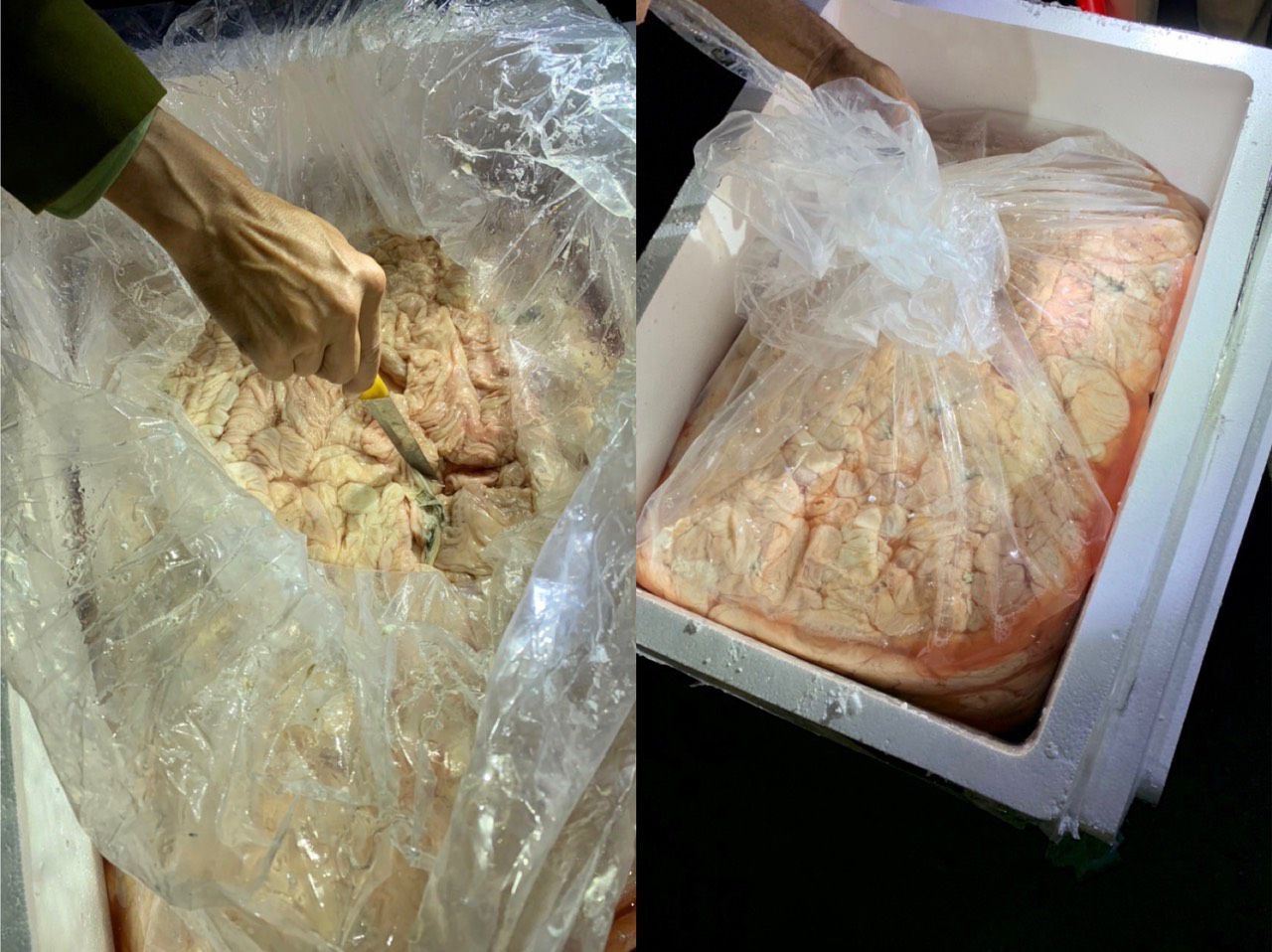 Kiểm tra trong thùng xe, lực lượng chức năng phát hiện có 33 thùng xốp đựng tổng cộng 1,7 tấn nội tạng, chủ yếu là lòng lợn. Tại thời điểm kiểm tra, toàn bộ số nội tạng động vật đã bốc mùi hôi thối, đang trong quá trình bị phân hủy.