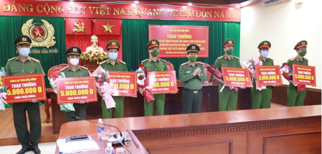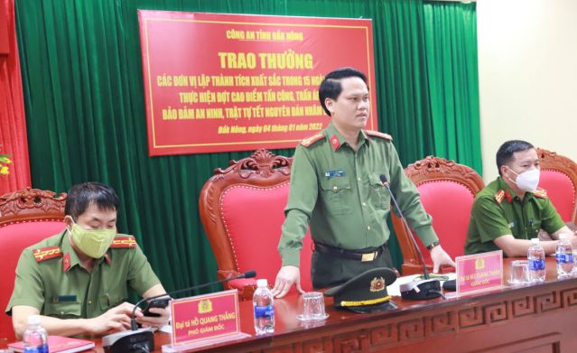 Chiều ngày 4/1/2022, Công an tỉnh Đắk Nông đã tổ chức biểu dương và trao thưởng cho đơn vị có thành tích xuất sắc trong 15 ngày đầu thực hiện đợt cao điểm tấn công, trấn áp tội phạm, bảo đảm an ninh, trật tự Tết Nguyên đán Nhâm Dần 2022. Đại tá Bùi Quang Thanh, Ủy viên Ban Thường vụ Tỉnh ủy, Bí thư Đảng ủy, Giám đốc Công an tỉnh chủ trì buổi trao thưởng. Tham gia buổi trao thưởng có Đại tá Hồ Quang Thắng, Phó Giám đốc Công an tỉnh, Đại tá Nguyễn Tường Vũ, Phó Giám đốc Công an tỉnh, lãnh đạo Công an một số đơn vị, địa phương trong tỉnh.