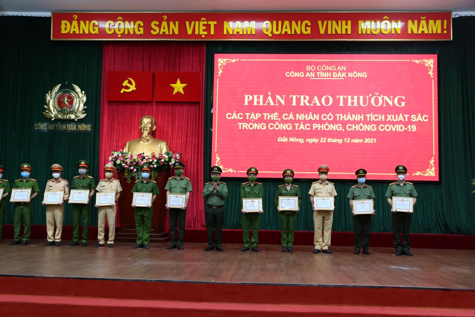 Với những thành tích, chiến công xuất sắc đó, năm 2021, lực lượng Công an Đắk Nông đã được Ðảng, Nhà nước, Bộ Công an, Tỉnh ủy, UBND tỉnh và các cấp, các ngành tặng thưởng nhiều phần thưởng cao quý. Trong đó, Chủ tịch nước tặng Huân chương chiến công hạng nhì, hạng ba cho 1 tập thể, 1 cá nhân, Huân chương Bảo vệ Tổ quốc hạng nhì, hạng ba cho 11 cá nhân; Thủ tướng Chính phủ công nhận danh hiệu chiến sĩ thi đua toàn quốc cho 1 cá nhân, Thủ tướng Chính phủ tặng Bằng khen cho 3 tập thể, 4 cá nhân; Bộ Công an công nhận chiến sĩ thi đua toàn lực lượng cho 4 cá nhân và thưởng nóng cho 20 tập thể với tổng số tiền là 215 triệu đồng; Bộ Công an, Tỉnh ủy, UBND tỉnh tặng bằng khen cho 98 tập thể, 207 cá nhân. Người dân trong và ngoài tỉnh gửi gần 100 lá thư cảm ơn, bày tỏ lòng cảm phục trước tinh thần vì Nhân dân phục vụ của cán bộ, chiến sĩ Công an tỉnh Đắk Nông. Tổng kết phong trào thi đua Vì an ninh Tổ quốc năm 2021 Công an tỉnh Đắk Nông vinh dự được Bộ Công an tặng cờ thi đua xuất sắc. Đây là năm thứ 4 liên tiếp Công an tỉnh Đắk Nông được Bộ Công an tặng Cờ thi đua “Đơn vị dẫn đầu phong trào thi đua Vì an ninh Tổ quốc”.