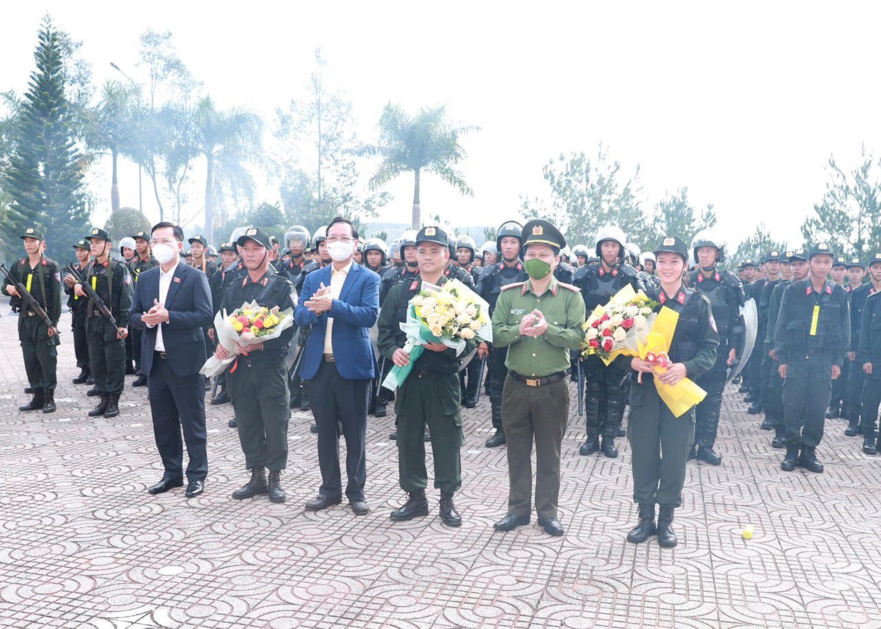 Các đồng chí lãnh đạo tặng hoa lực lượng Cảnh sát cơ động.