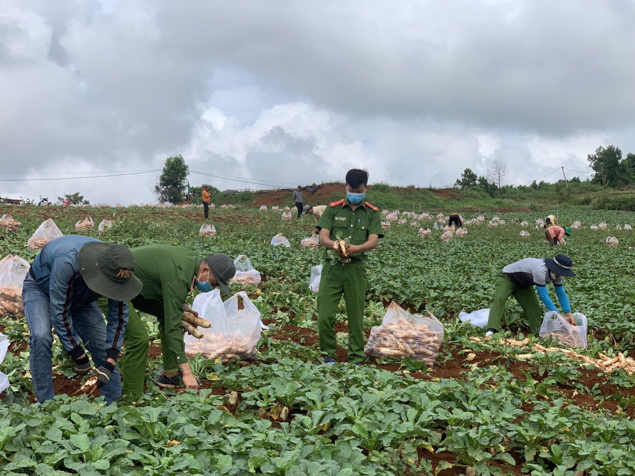 CBCS Công an xã Đắk Búk So và Đoàn Thanh niên, Hội phụ nữ Công an huyện Tuy Đức tích cực thu hái, đóng gói, vận chuyển rau củ, quả gửi tặng quân và dân vùng dịch.