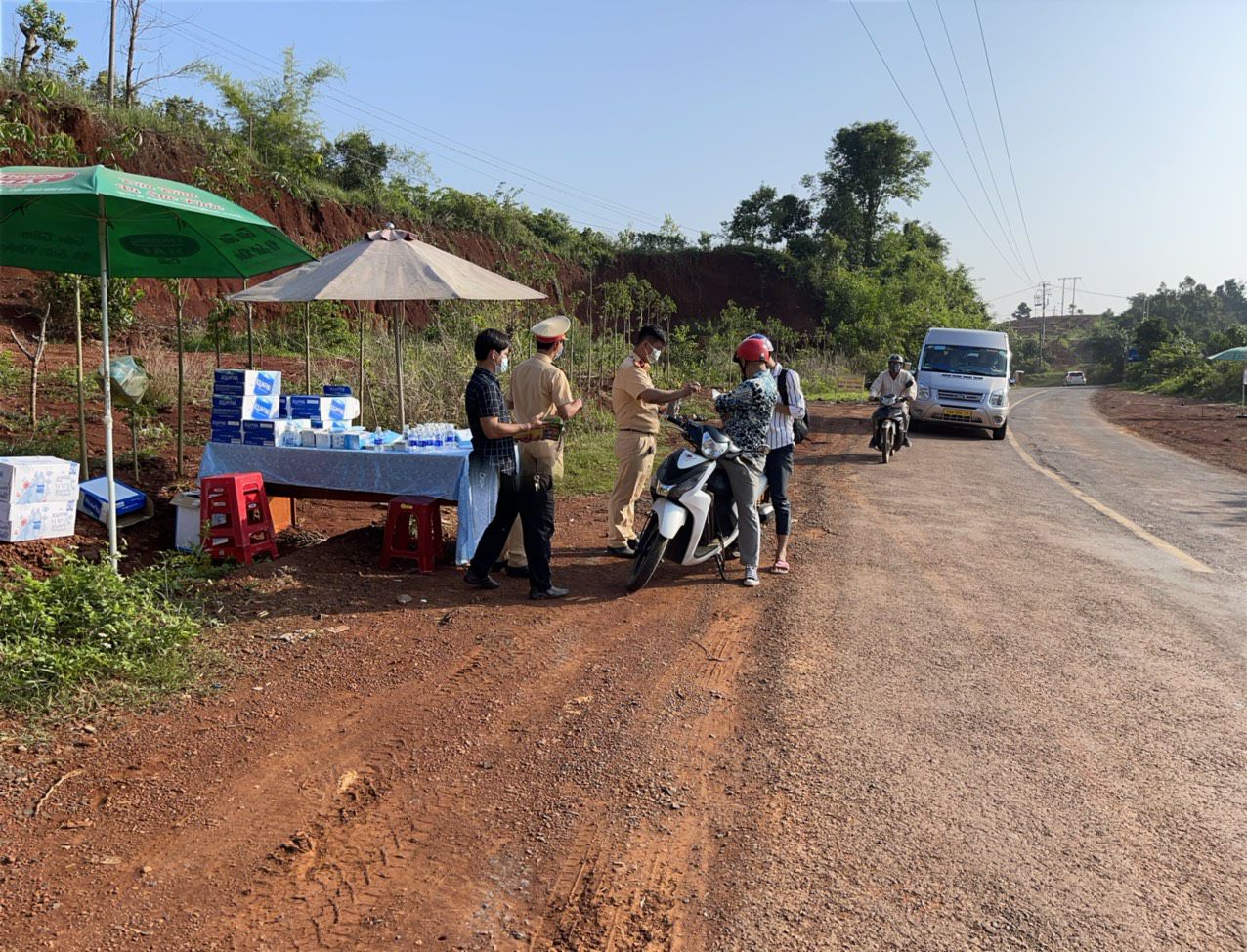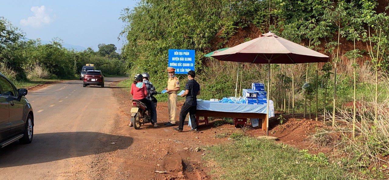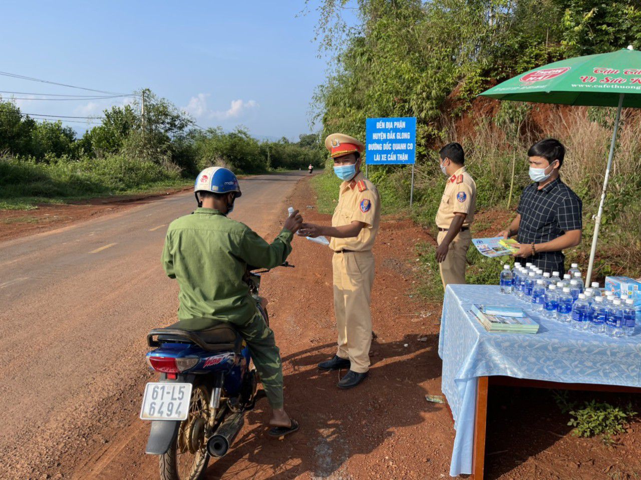 Theo đó, trong ngày 30/4, lực lượng Công an huyện Đắk Glong đã lập chốt trên Quốc lộ 28 (đoạn qua xã Quảng Khê, huyện Đắk Glong) để phát gần 1.000 cái khẩu trang y tế; 500 chai nước uống; 1.000 tờ rơi tuyên truyền; 300 cuốn cẩm nang lái xe mô tô, xe gắn máy an toàn cho người tham gia giao thông. Đồng thời lồng ghép tuyên truyền, vận động, nhắc nhở người dân phải chấp hành nghiêm các quy định của pháp luật về an toàn giao thông như: đi đúng phần đường, làn đường, tốc độ quy định, đội mũ bảo hiểm... Bên cạnh đó, các lực lượng cũng vận động người dân thực hiện tốt thông điệp 5K của Bộ Y tế về phòng, chống dịch bệnh Covid-19.