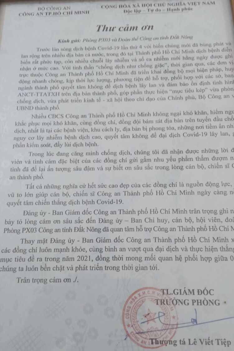 Công an Thành phố Hồ Chí Minh gửi thư cảm ơn tập thể Phòng Công tác Đảng và công tác chính trị Công an tỉnh Đắk Nông.