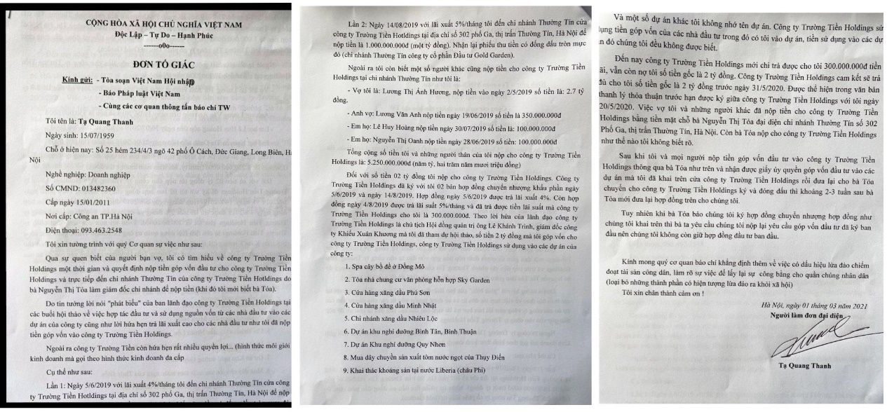 Cũng theo đơn tố cáo gửi các cơ quan chức năng, ông Tạ Quang Thanh đại diện cho 119 cổ đông góp vốn vào Công ty Trường Tiền Holdings với giá trị trên 57 tỷ đồng. Ông cho biết: “Vào ngày 13/01/2019, … chúng tôi được mời tới dự và xem các video về hoạt động kinh doanh của Tập đoàn, được nhận một quyển sổ hồ sơ năng lực 10 năm có sơ đồ bộ máy nhân sự cao cấp, các công ty thành viên và nhiều dự án kinh doanh của tập đoàn trên cả nước. Do vậy, chúng tôi đã rất tin tưởng và đã ký hợp đồng đầu tư góp vốn vào các dự án của tập đoàn. Trong hợp đồng có cả 3 bên (cổ đông, tập đoàn và ngân hàng) nhưng đến ngày 11/09/2019, công ty có thông báo số: 09/11/2019 TTG về việc thay đổi mẫu hợp đồng góp vốn sang cổ phần để đảm bảo tính pháp lý cao hơn và quyền lợi tối đa cho quý cổ đông. Chúng tôi được cán bộ tập đoàn giải thích là chỉ thay đổi ngôn từ còn các quyền lợi vẫn giữ như hợp đồng góp vốn. Thời điểm đó nhiều người nghi ngờ thấy rằng hợp đồng sau không có các điều khoản như hợp đồng trước thì xin thanh lý rút vốn ngay (Kể cả mới nộp tiền 1 ngày trước đó) nhưng khi xin rút thì lãnh đạo công ty không cho rút”.