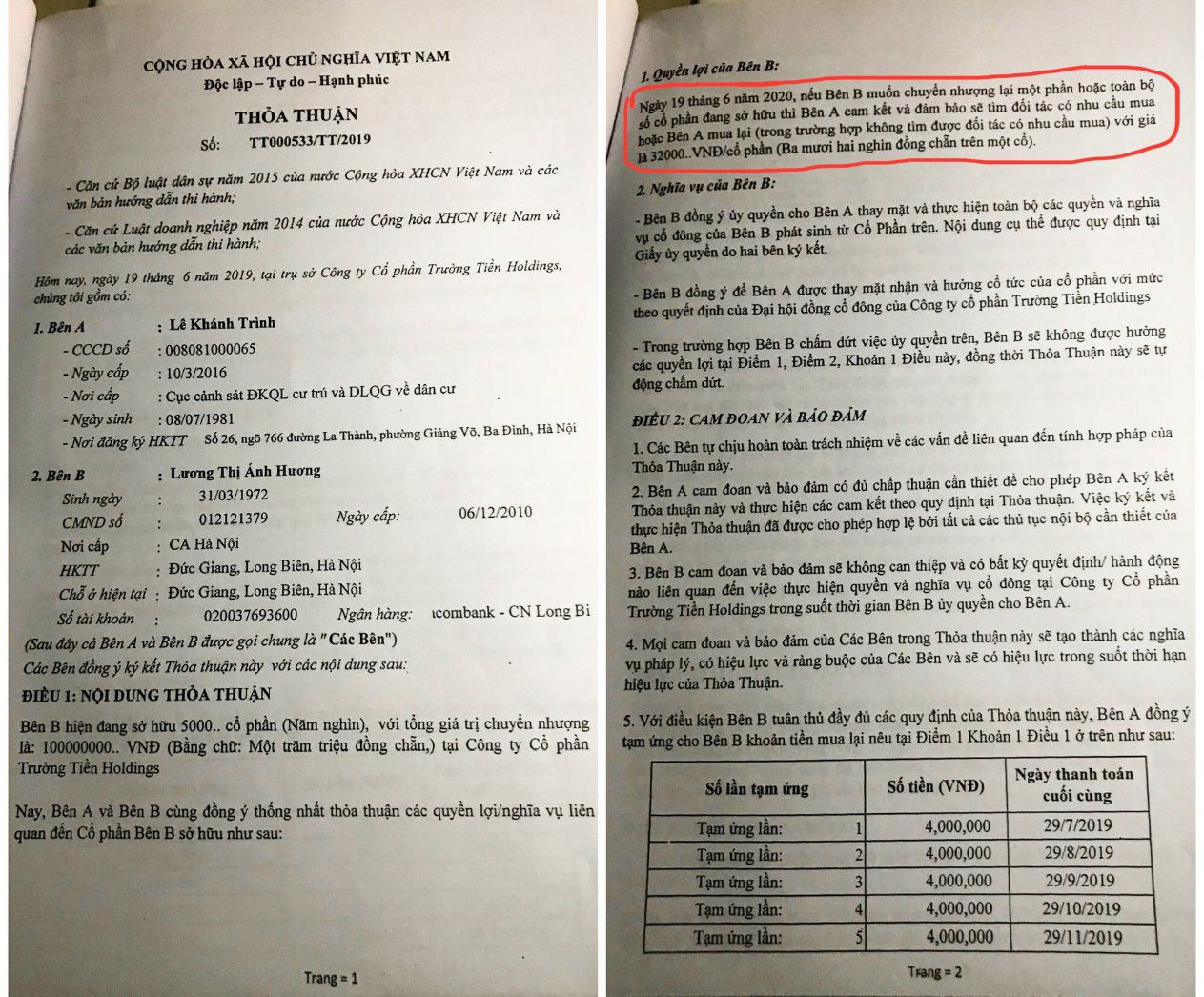 Ngoài ra, trong các hợp đồng thỏa thuận, công ty Trường Tiền Holdings vẫn hứa với người mua cổ phần về những quyền lợi hấp dẫn. Cụ thể: Tại hợp đồng thỏa thuận Số: TT000533/TT/2019 giữa Công ty Trường Tiền Holdings và bà Lương Thị Ánh Hương, ghi rõ: “Ngày 19 tháng 6 năm 2020, nếu bên B (tức bà Lương Thị Ánh Hương) muốn chuyển nhượng lại một phần hoặc toàn bộ số cổ phần đang sở hữu thì bên A (tức công ty Trường Tiền Holdings) cam kết và đảm bảo sẽ tìm đối tác có nhu cầu mua hoặc bên A mua lại trong trường hợp không tìm được đối tác có nhu cầu mua với giá là 32.000 VNĐ/cổ phần”. Tuy nhiên, những cam kết đó của Công ty Trường Tiền Holdings đến thời điểm này vẫn không được giải quyết chính đáng.