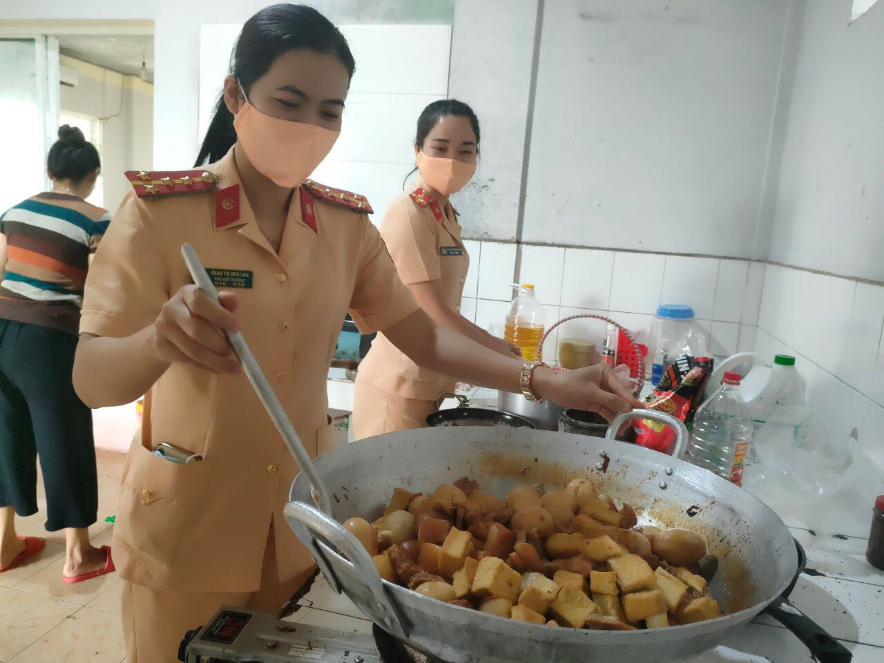 CBCS Phòng CSGT Công an tỉnh Đắk Nông tranh thủ ngày nghỉ cuối tuần tự tay đi chợ, chế biến hơn 70 phần cơm phục vụ các y, bác sĩ và các bệnh nhân đang điều trị tại khu cách ly điều trị của tỉnh.
