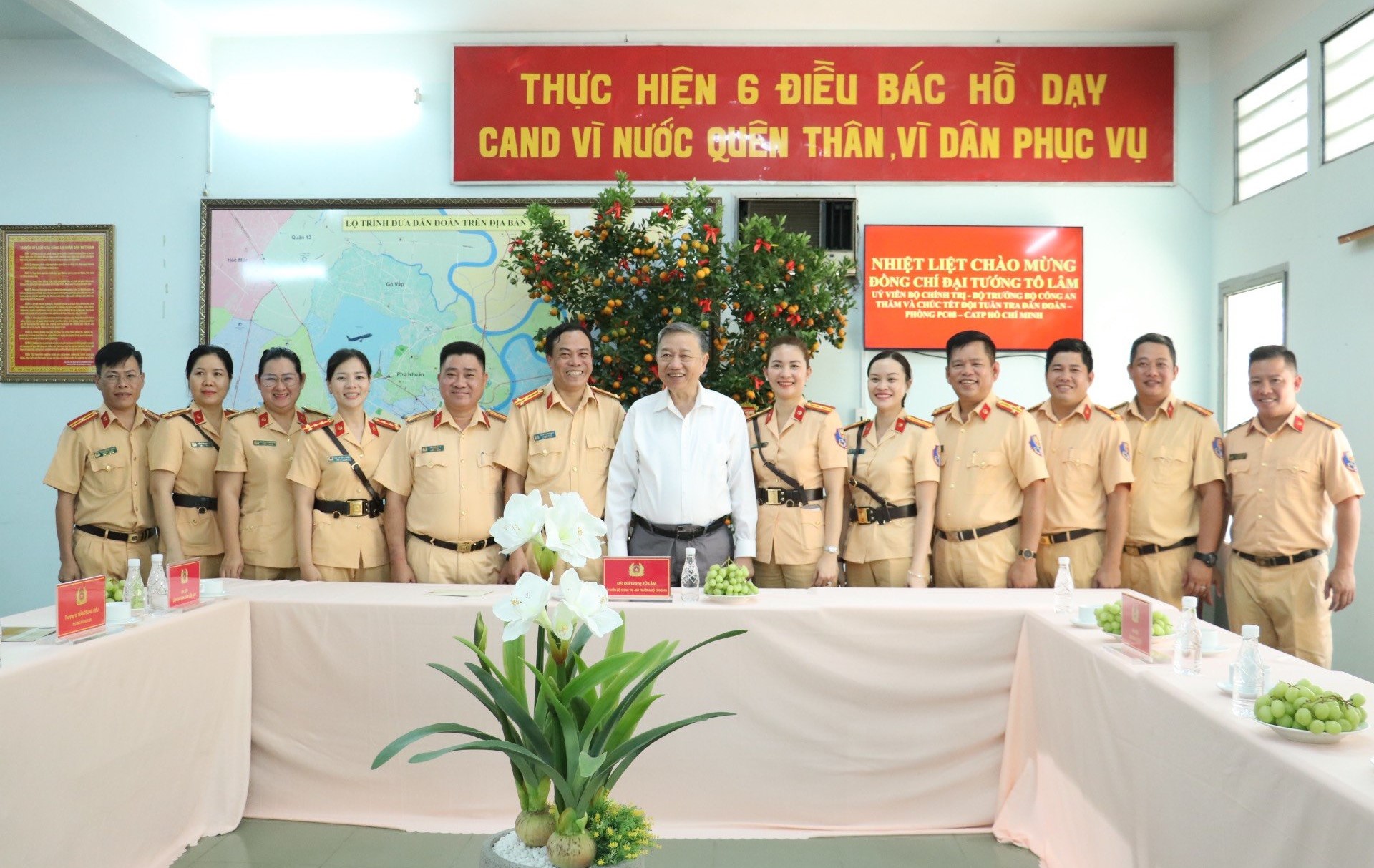 Tại buổi chúc Tết, Đồng chí Bộ trưởng đánh giá cao những kết quả đạt được của Đội Tuần tra dẫn đoàn. Là một đơn vị đặc thù trong lực lượng Công an nhân dân Việt Nam có nhiệm vụ đưa, dẫn các đoàn khách quốc tế, đoàn lãnh đạo Đảng, Nhà nước được an toàn, nhanh chóng trong một đô thị có mật độ dân cư và phương tiện lớn, phức tạp như Tp. Hồ Chí Minh nhưng Phòng CSGT và Đội Tuần tra dẫn đoàn vẫn đảm bảo và thực hiện tốt nhiệm vụ được giao; được các đồng chí lãnh đạo Đảng, Nhà nước ta và nguyên thủ của các Quốc gia khi đến thăm và làm việc tại Tp. Hồ Chí Minh khen ngợi và đánh giá cao, góp phần tạo hình ảnh đẹp về người CSGT nói riêng và lượng Công an Nhân dân Việt Nam nói chung chính quy, tinh nhuệ, hiện đại trong mắt bạn bè quốc tế.