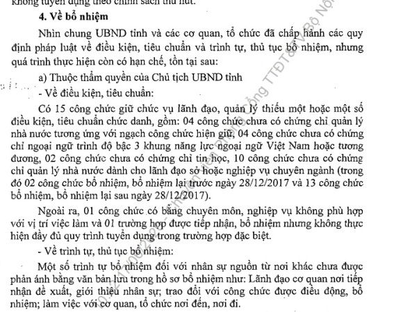 Theo kết luận thanh tra, về bổ nhiệm, nhìn chung UBND tỉnh và các cơ quan, tổ chức đã chấp hành các quy định pháp luật về điều kiện, tiêu chuẩn và trình tự, thủ tục bổ nhiệm, nhưng quá trình thực hiện còn có hạn chế, tồn tại.