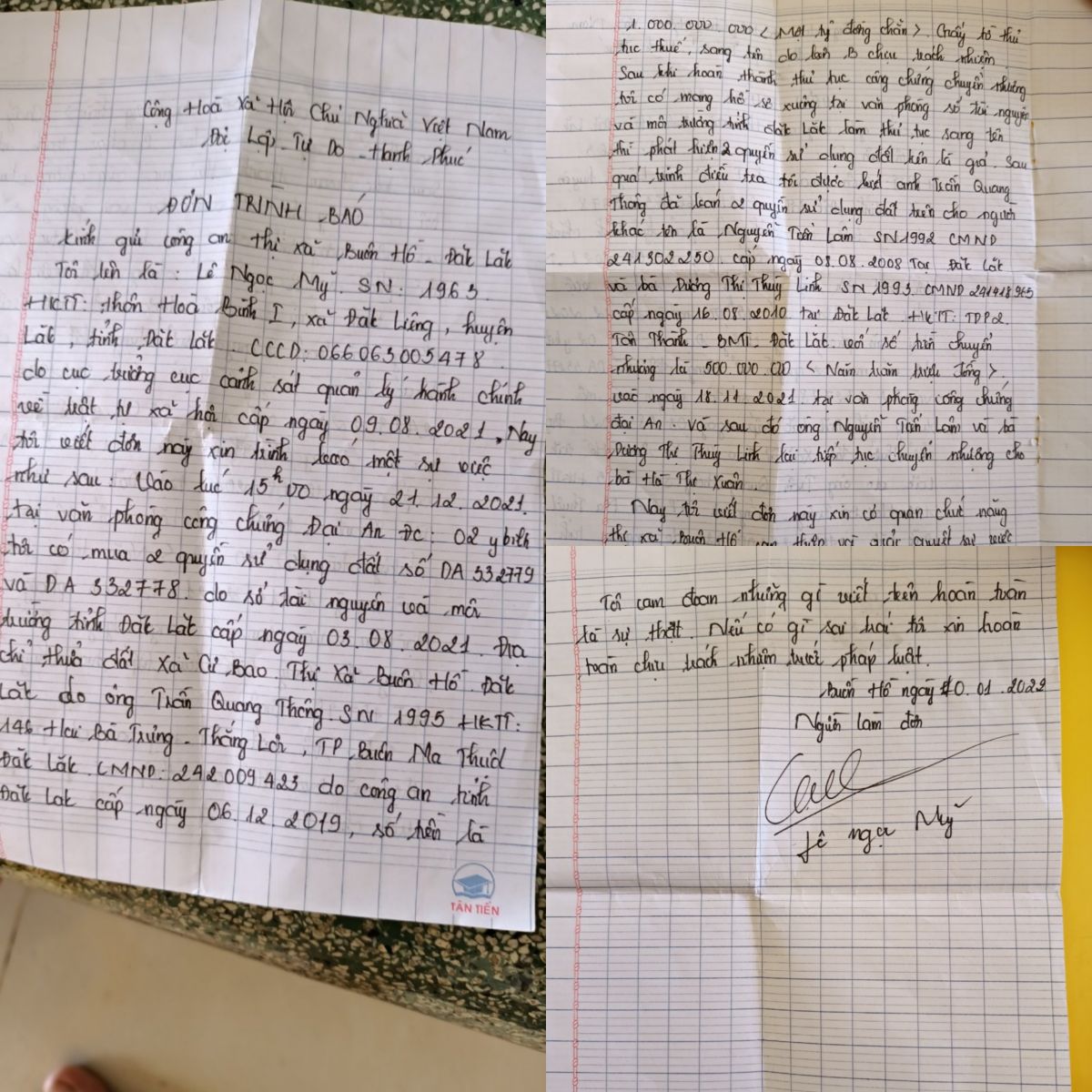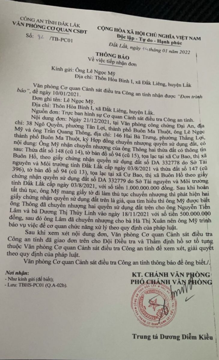 Vừa qua công an tỉnh Đắk Lắk nhận được đơn trình báo của ông Lê Ngọc Mỹ trú tại thôn Hòa Bình 1, xã Đắk Liêng, huyện Lắk về việc ông Mỹ nhận được 2 quyền sử dụng đất giả. Theo nội dung đơn ngày 21 tháng 12 năm 2021 tại văn phòng công chứng Đại An địa chỉ 38 Ngô Quyền, Phường Tân Lợi, thành phố Buôn Ma Thuột, ông Lê Ngọc Mỹ và ông Trần Văn Thông trú tại 146 Hai Bà Trưng, phường Thắng Lợi, thành phố Buôn Ma Thuột, ký hợp đồng chuyển nhượng quyền sử dụng đất, có nội dung: “ông Mỹ nhận chuyển nhượng của ông thông hai thửa đất có thông tin sau; thửa số 148 (cũ 14) thửa Số 96 (cũ 15) tọa lạc tại xã Cư Bao, thị xã Buôn Hồ, theo giấy chứng nhận quyền sử dụng đất số DA 332778 do sở Tài nguyên và Môi trường tỉnh Đắk Lắk cấp ngày 3/8/2021, và thửa số 147 (Cũ 396), tờ bản đồ số 94 (cũ 13), tọa lạc tại xã Cư Bao, thị xã Buôn Hồ theo giấy chứng nhận quyền sử dụng đất số DA 332779 do Sở Tài nguyên và Môi trường tỉnh Đắk Lắk cấp ngày 3/8/2021, với số tiền 1 tỷ đồng”.