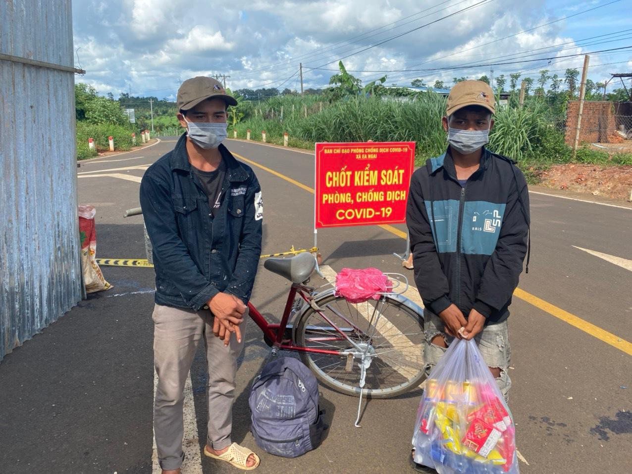 Chiều 4/9, Đại uý Nguyễn Xuân Ngọc - Trưởng chốt kiểm soát dịch COVID-19 của huyện Krông Búk (đoạn Tỉnh lộ 8 giao với Đường tránh thị xã Buôn Hồ) cho biết, đơn vị vừa hỗ trợ lương thực và ít tiền để 2 thanh niên đi xe đạp từ Đắk Lắk về Kon Tum.