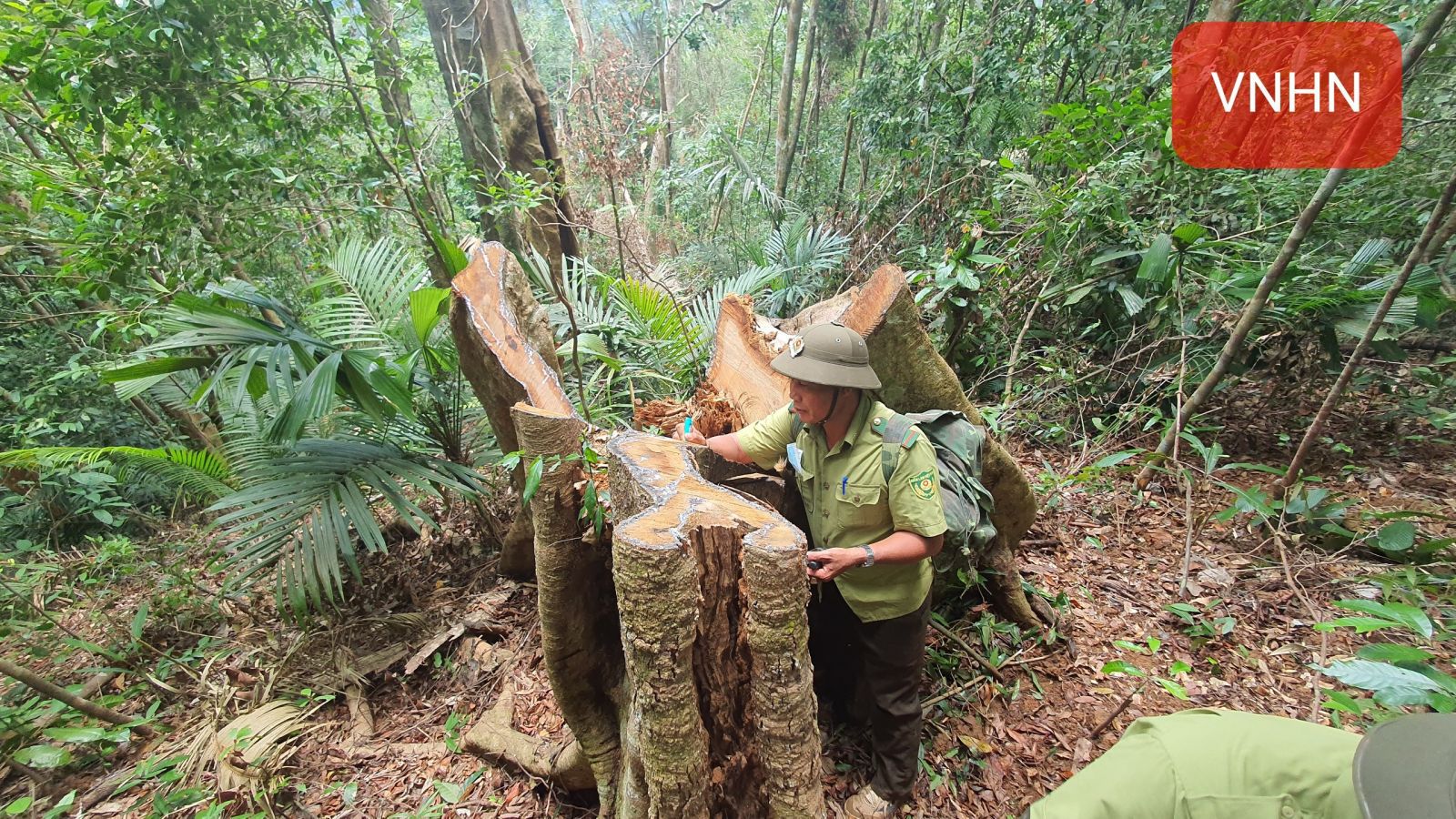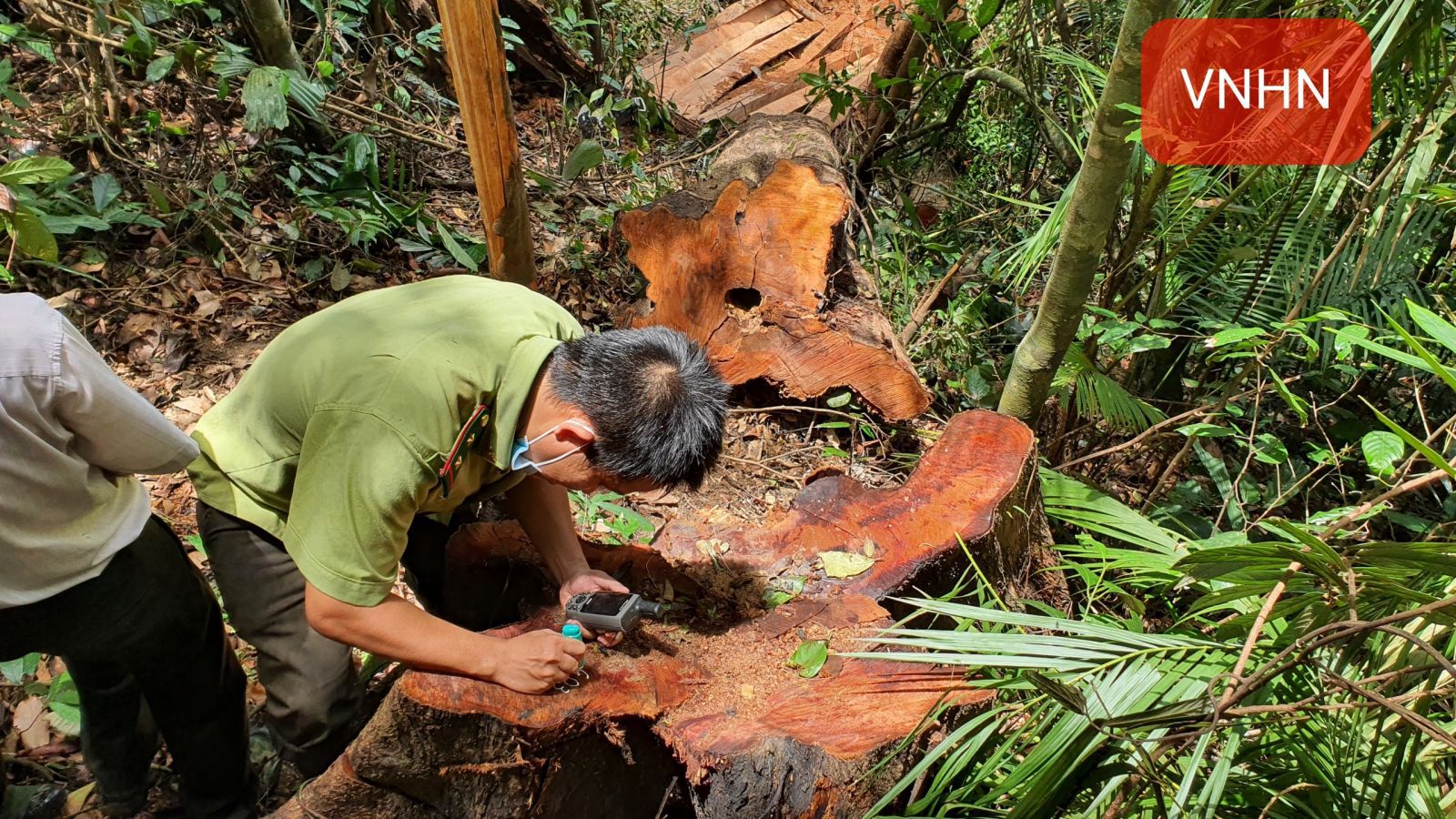 Lực lượng Kiểm lâm đang tiến hành đo đạc, xác định toạ độ những cây bị cưa hạ...