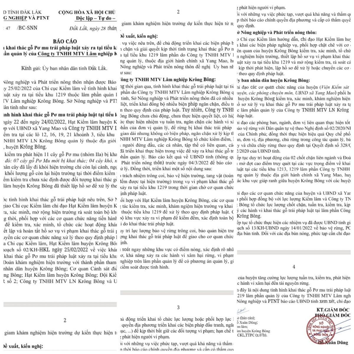 Liên quan đến vụ khai thác trái phép cây Pơ Mu mà PLQL đã phản ánh tại tiểu khu 1219 thuộc lâm phần quản lý của Công ty TNHH MTV Lâm nghiệp Krông Bông, Sở Nông Nghiệp và Phát triển nông thôn đã có báo cáo số 47/BC-SNN gửi UBND tỉnh, đồng thời thành lập Đoàn khám nghiệm, mở rộng hiện trường để điều tra xác minh.