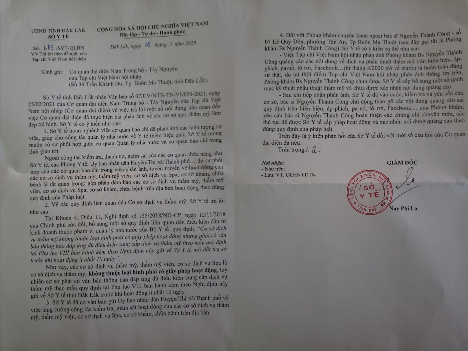 Ngày 05/03, Sở Y tế tỉnh Đắk Lắk đã có văn bản số 689/SYT-QLHN trả lời những nội dung liên quan đến việc Tạp chí Việt Nam Hội nhập, Cơ quan đại diện Nam Trung bộ - Tây Nguyên có bài phản ánh về các cơ sở spa, thẩm mỹ làm đẹp trá hình trên địa bàn Tp. Buôn Ma Thuột.