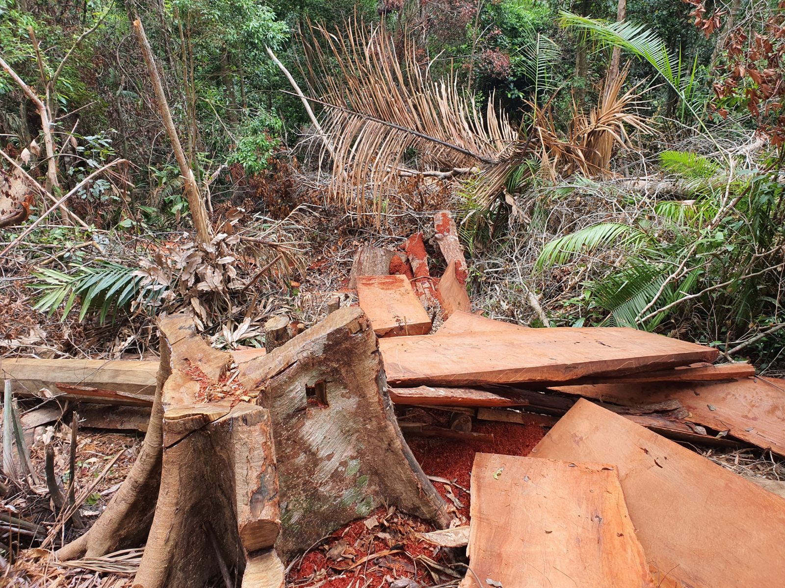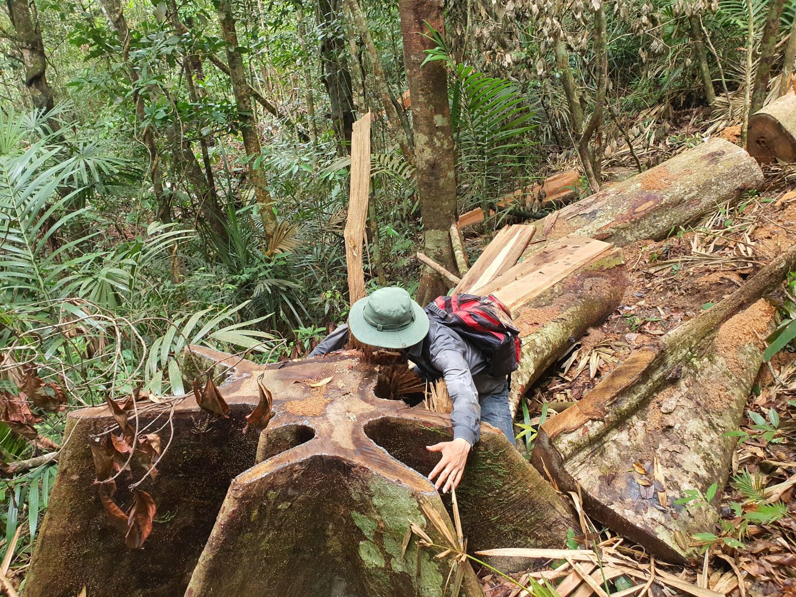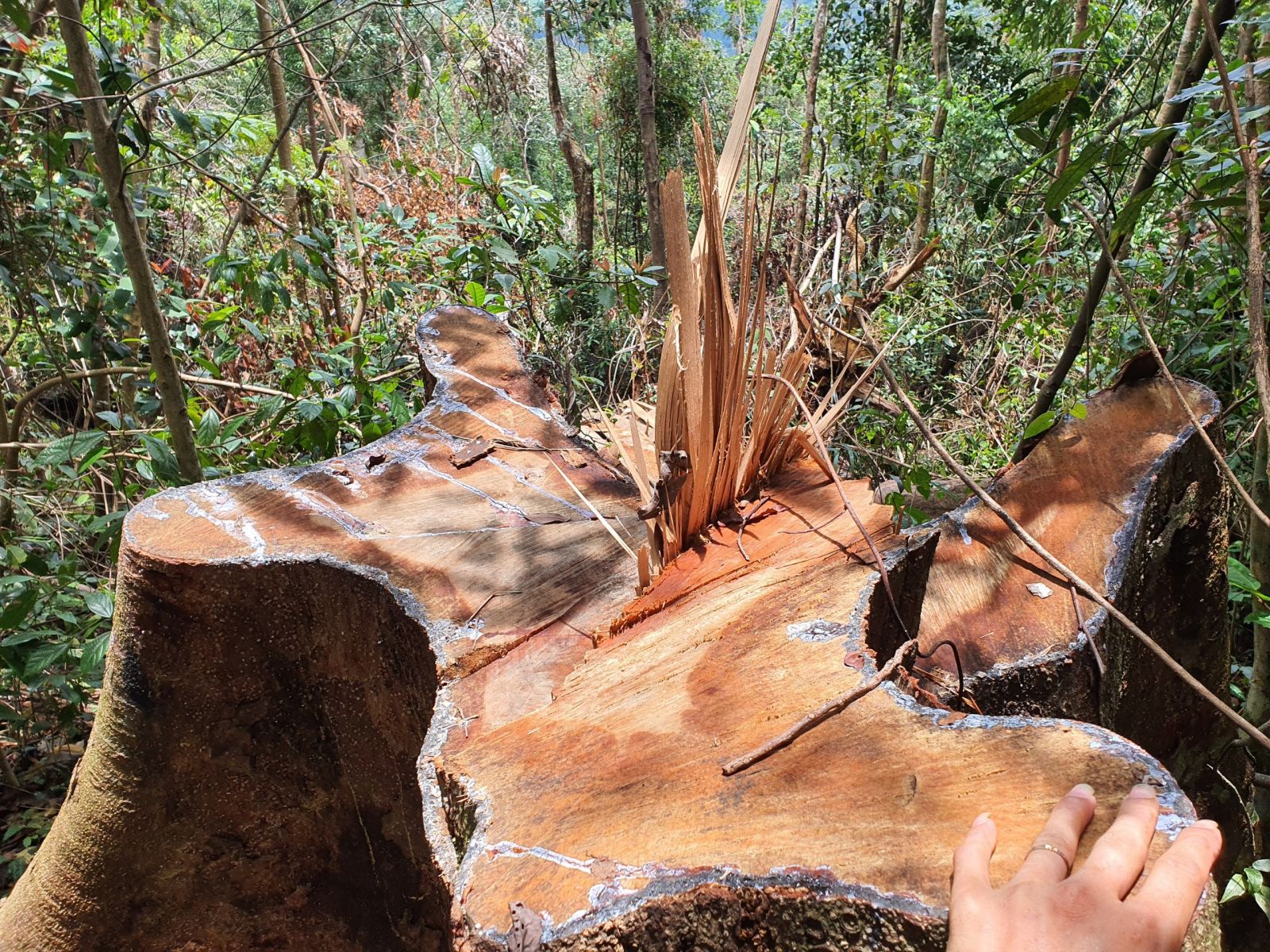 Tại trục đường này, từ giữa sườn rừng cho đến đỉnh của rừng, nhiều con đường xương cá được rẽ nhánh đi nhiều hướng, ước tính nếu để di chuyển hết những cung đường ấy chắc phải hơn một ngày. Theo những con đường này, cảnh tượng của một “Đại công trường” khai thác gỗ lậu dần hiện rõ khi trước mắt chúng tôi là những cây gỗ lớn có đường kính từ 50 đến khoảng 120cm bị đốn hạ, nằm la liệt, phân bủa khắp nơi. Có lẽ, phải có đến hàng trăm cây gỗ như thế bị đốn hạ, đa số đã bị xẻ hộp và mang đi, chỉ còn những gốc cây đang chảy nhựa như đang khóc cho số phận hẩm hiu của chính nó. Bên cạnh đó, nhiều gốc cây đã vươn mầm, vết tích đã rất lâu, chứng tỏ rằng, nguồn tin mà chúng tôi tìm hiểu là đúng, tình trạng khai thác gỗ tại đây đã diễn ra trong một thời gian dài.