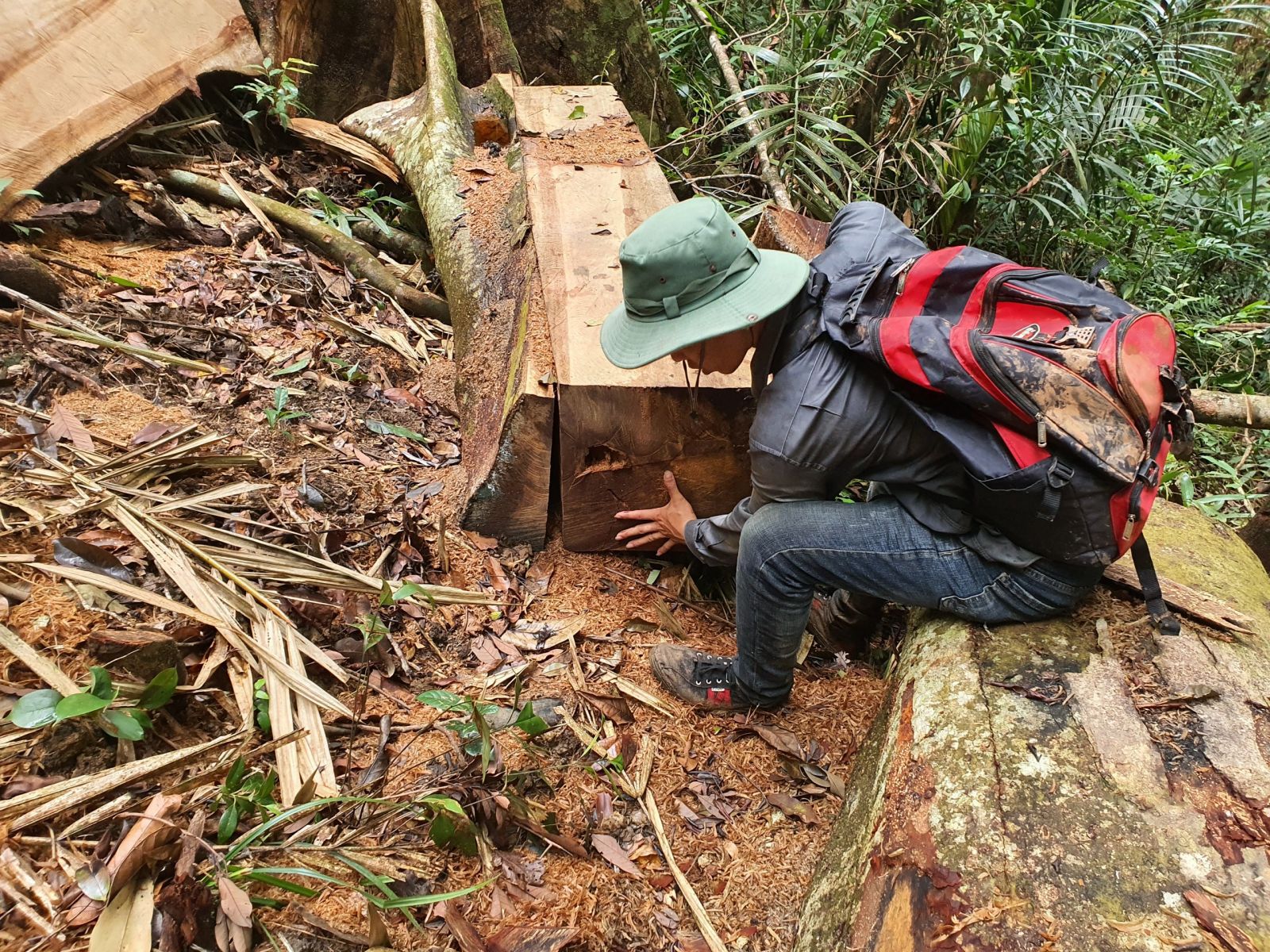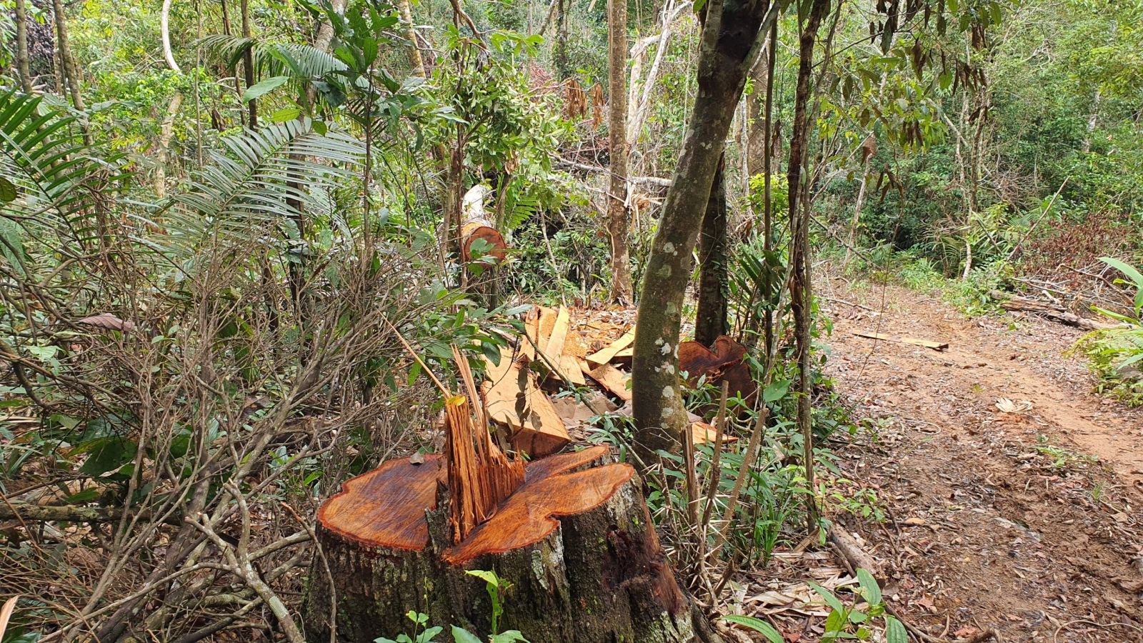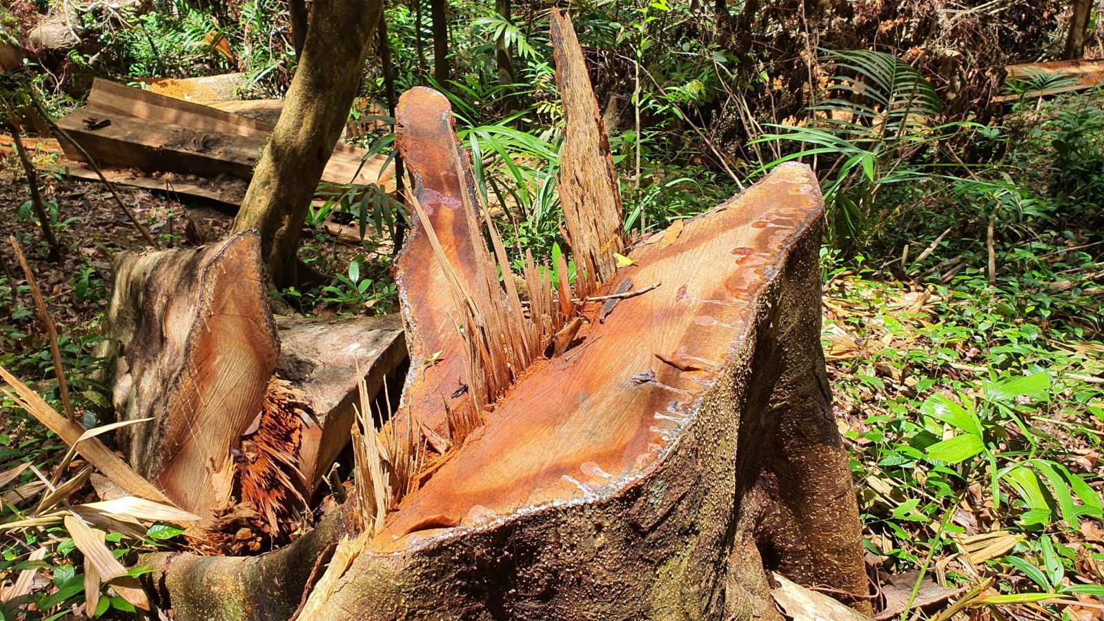 Tại trục đường này, từ giữa sườn rừng cho đến đỉnh của rừng, nhiều con đường xương cá được rẽ nhánh đi nhiều hướng, ước tính nếu để di chuyển hết những cung đường ấy chắc phải hơn một ngày. Theo những con đường này, cảnh tượng của một “Đại công trường” khai thác gỗ lậu dần hiện rõ khi trước mắt chúng tôi là những cây gỗ lớn có đường kính từ 50 đến khoảng 120cm bị đốn hạ, nằm la liệt, phân bủa khắp nơi. Có lẽ, phải có đến hàng trăm cây gỗ như thế bị đốn hạ, đa số đã bị xẻ hộp và mang đi, chỉ còn những gốc cây đang chảy nhựa như đang khóc cho số phận hẩm hiu của chính nó. Bên cạnh đó, nhiều gốc cây đã vươn mầm, vết tích đã rất lâu, chứng tỏ rằng, nguồn tin mà chúng tôi tìm hiểu là đúng, tình trạng khai thác gỗ tại đây đã diễn ra trong một thời gian dài.