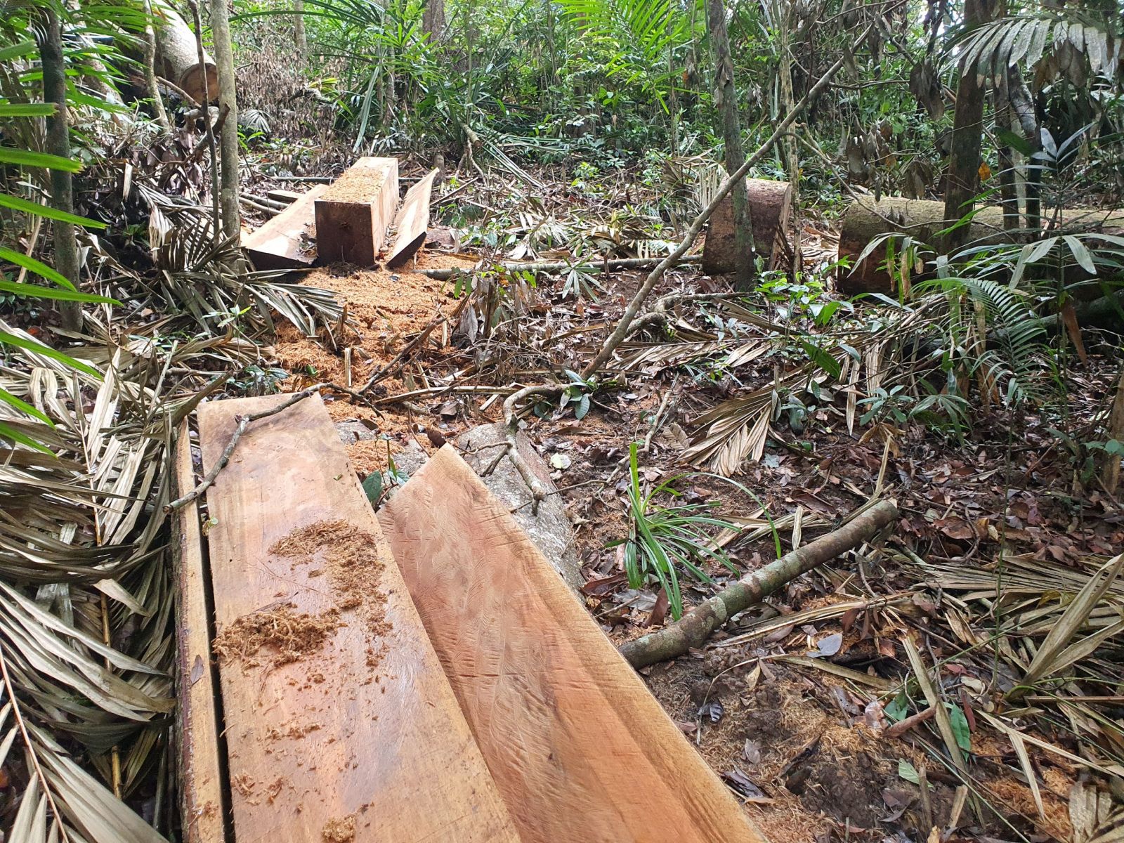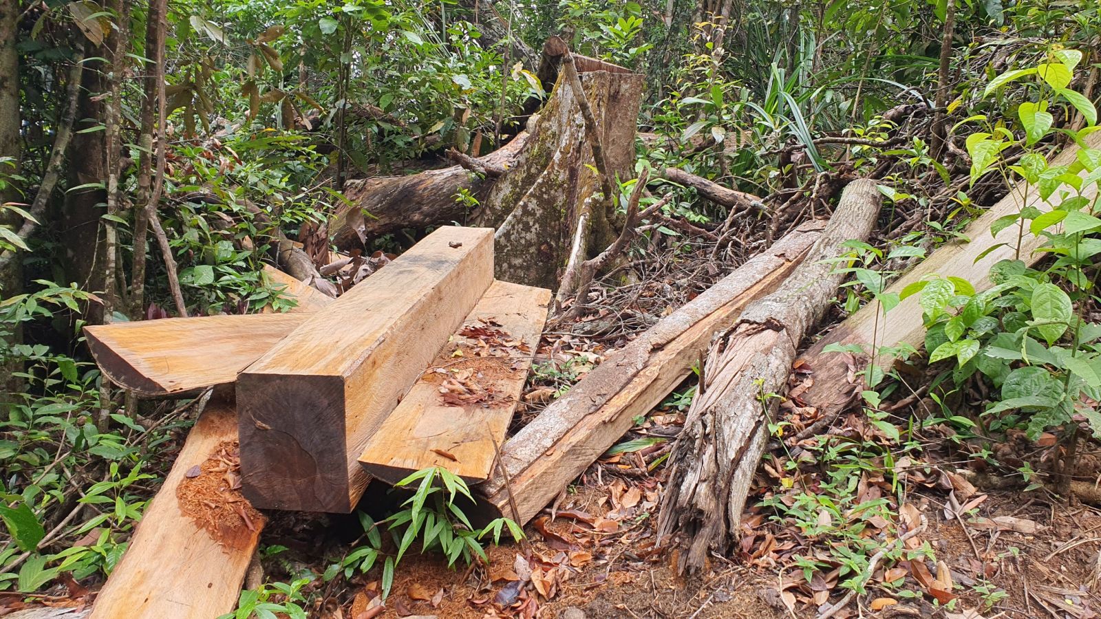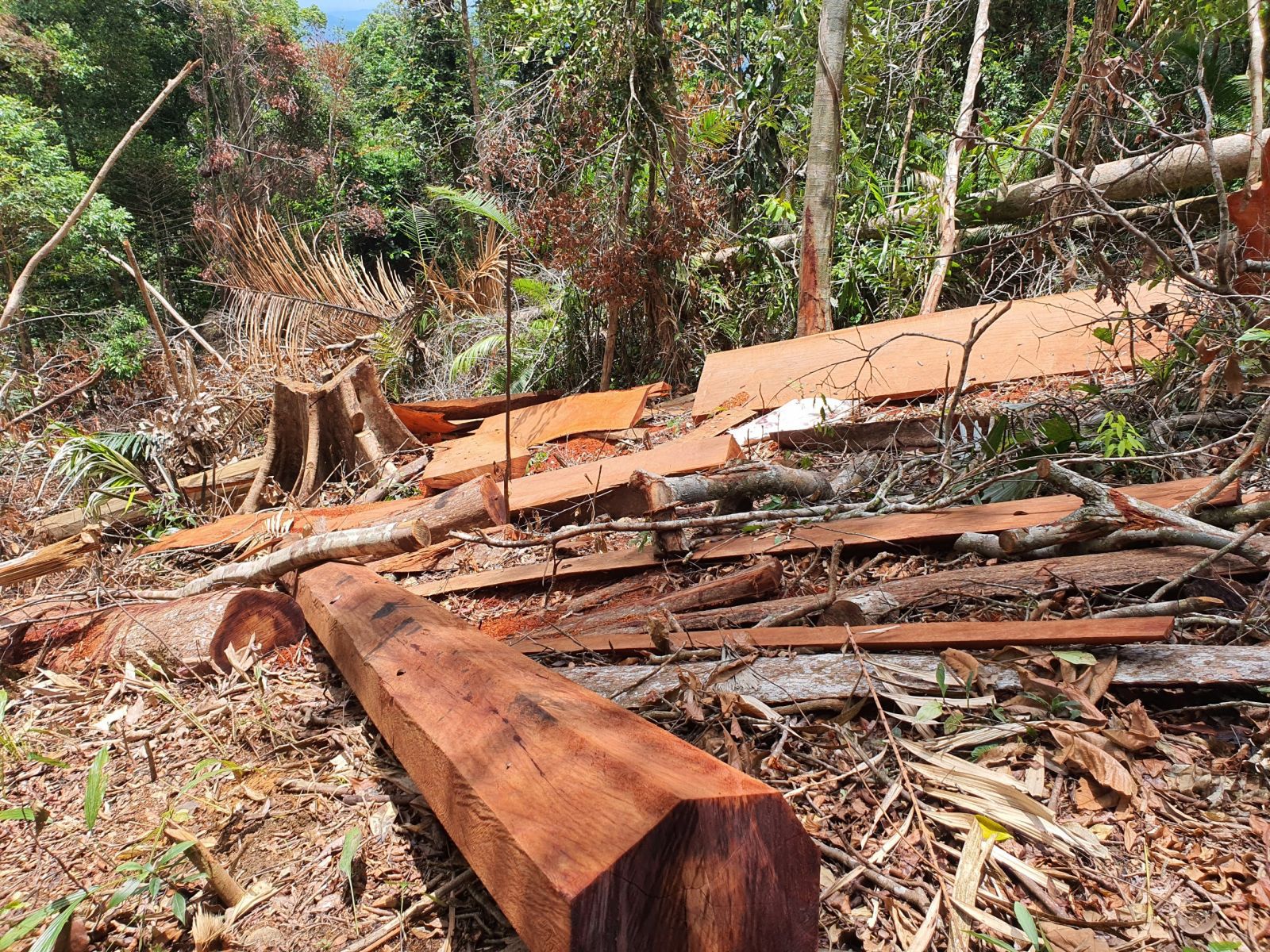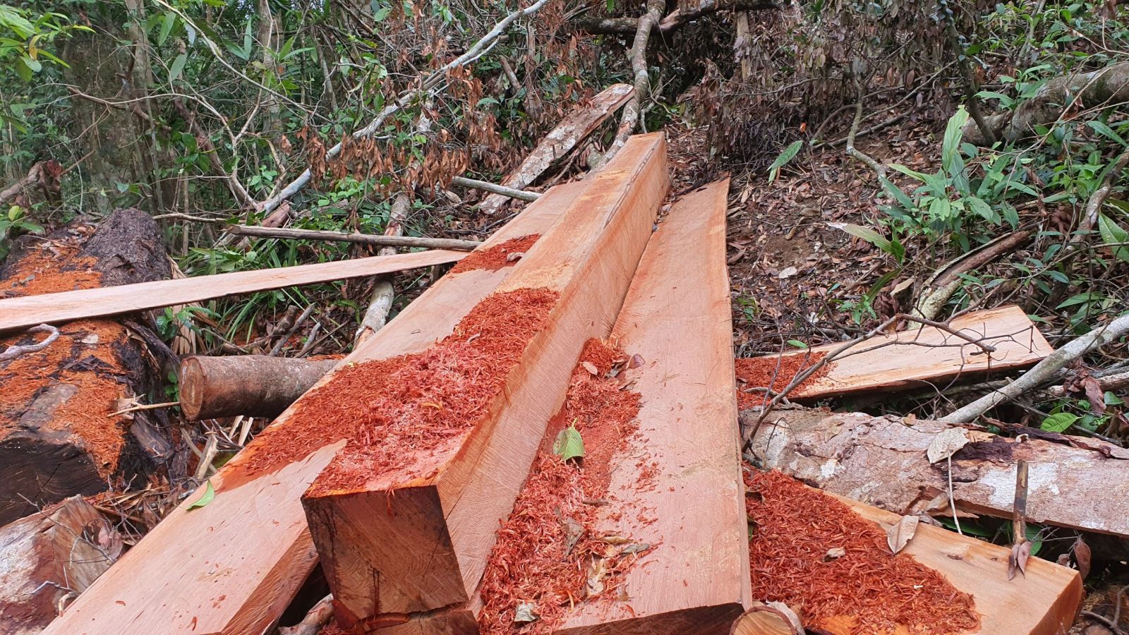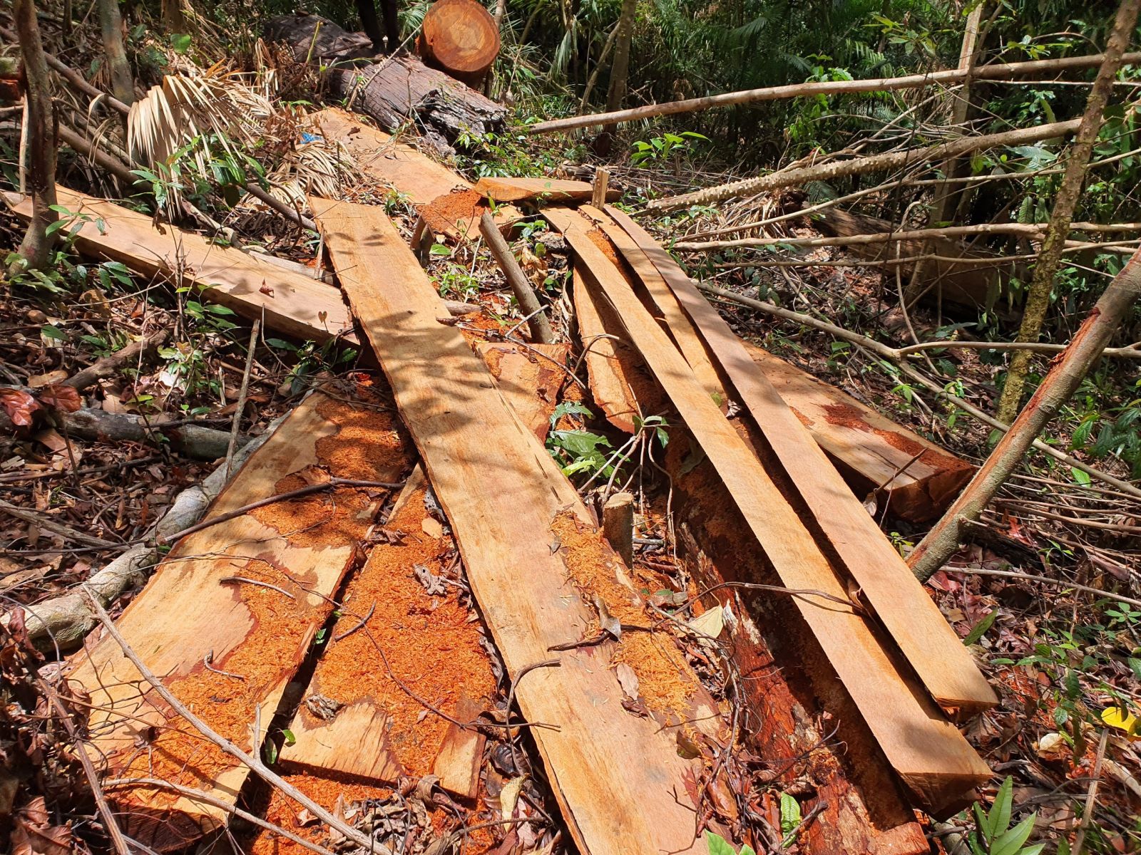 Nhiều cây vừa bị đốn hạ, xẻ hộp chờ chở đi.
