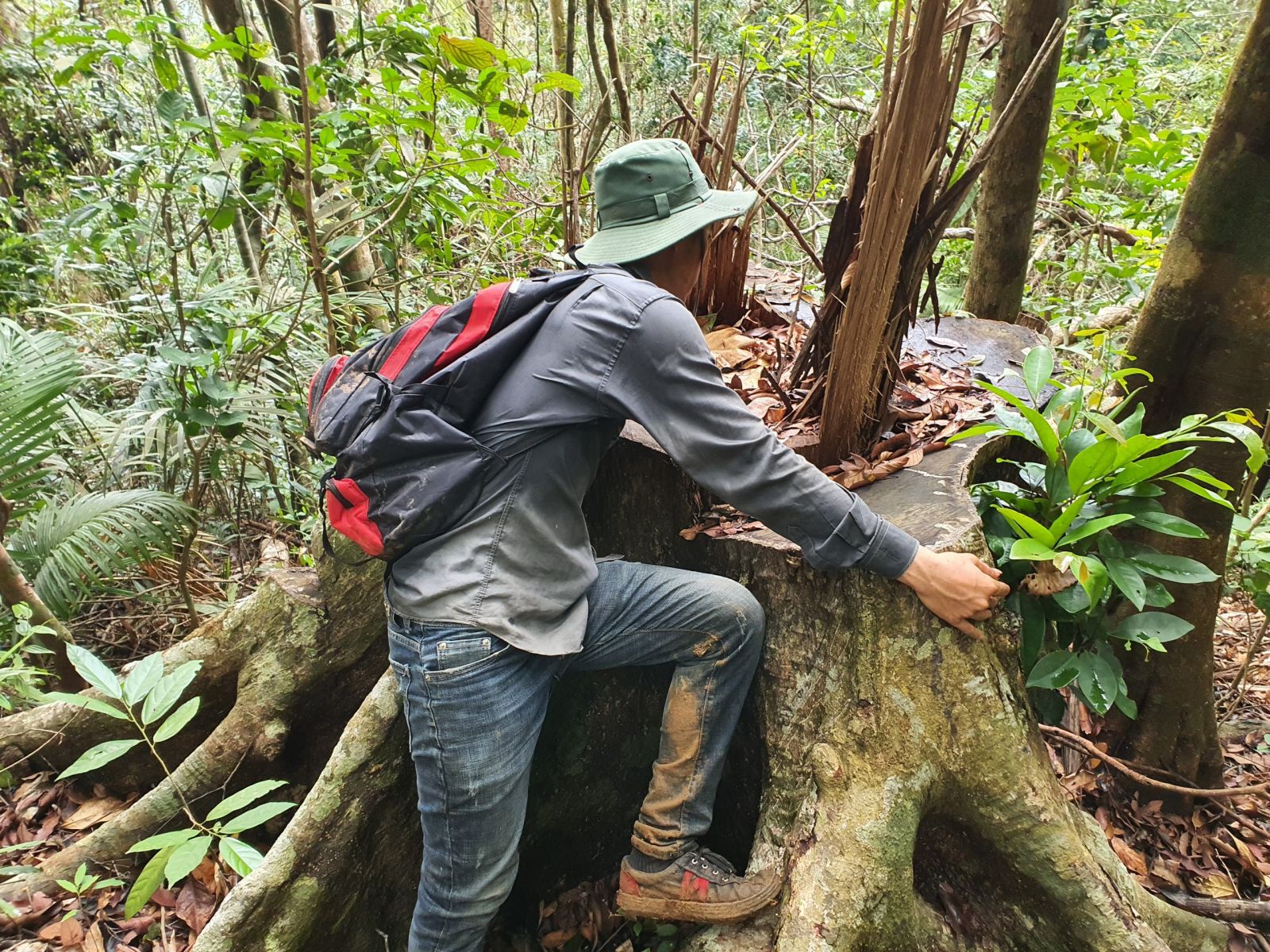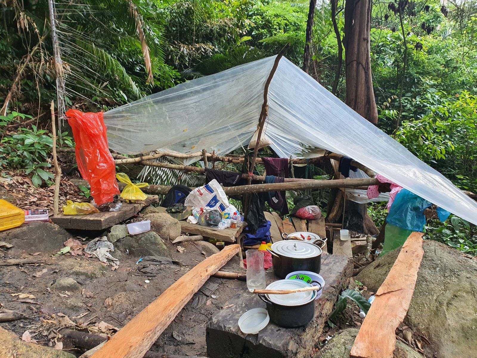 Nhân lúc các đối tượng đang say sưa phá rừng, Pv liều mình tiếp cận lán trại của lâm tặc.