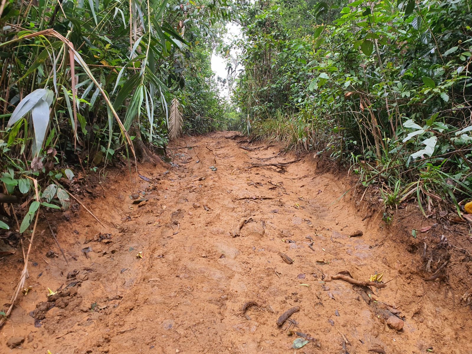 Đường lên rừng dốc cao, trơn trượt, in hằn dấu tích của xe máy cày độ chế.