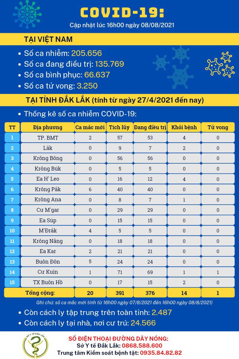 Đến nay, tỉnh này có 391 trường hợp mắc COVID-19, trong đó có 14 ca xuất viện và một trường hợp qua đời. Hiện, TP. Buôn Ma Thuột đang thực hiện giãn cách xã hội theo Chỉ thị 16 của Thủ tướng và huyện Cư Kuin thực hiện Chỉ thị 15./.