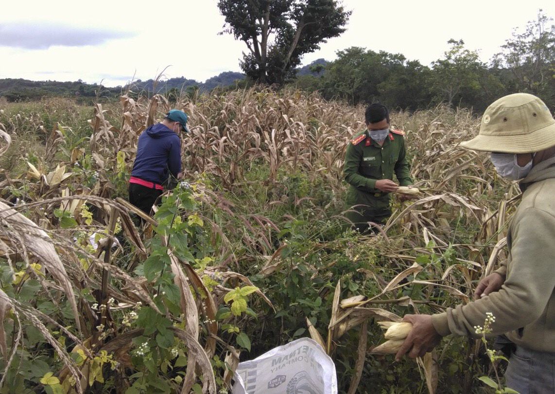 Lực lượng Công an phối hợp với các ban, ngành, đoàn thể hỗ trợ người dân Buôn Choah thu hoạch bắp.