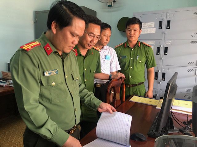 Trung tá Nguyễn Hữu Đức, Phó Giám đốc Công an tỉnh kiểm tra việc triển khai phân cấp đăng ký xe tại Công an cơ sở.
