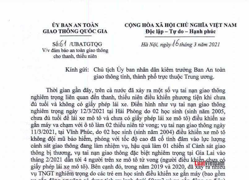 Công văn của Ủy ban An toàn giao thông Quốc gia về việc đảm bảo an toàn giao thông cho thanh, thiếu niên. (Ảnh: LuatVietNam)