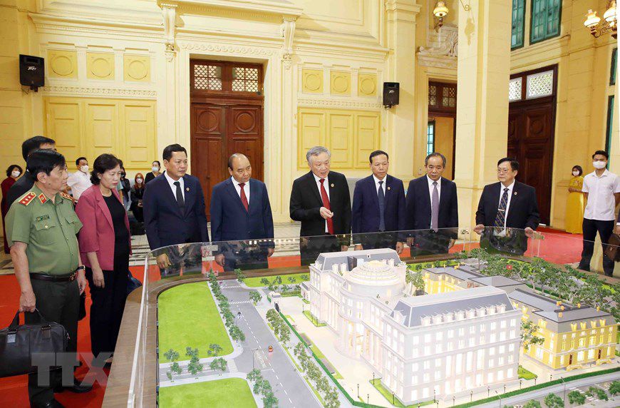 Chủ tịch nước Nguyễn Xuân Phúc tham quan mô hình trụ sở mới của Tòa án nhân dân Tối cao - Ảnh: TTXVN