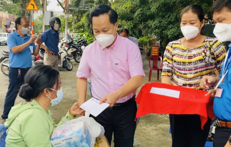 Chủ tịch UBND Thành phố Thủ Đức Hoàng Tùng động viên tặng quà cho người dân