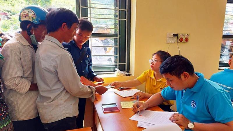 Cán bộ Bưu điện, Bảo hiểm xã hội huyện Nậm Pồ chi trả tiền hỗ trợ cho hộ nghèo, cận nghèo xã Vàng Đán bị ảnh hưởng do dịch bệnh Covid-19 tháng 8/2020. Ảnh: báo Dân tộc và Phát triển