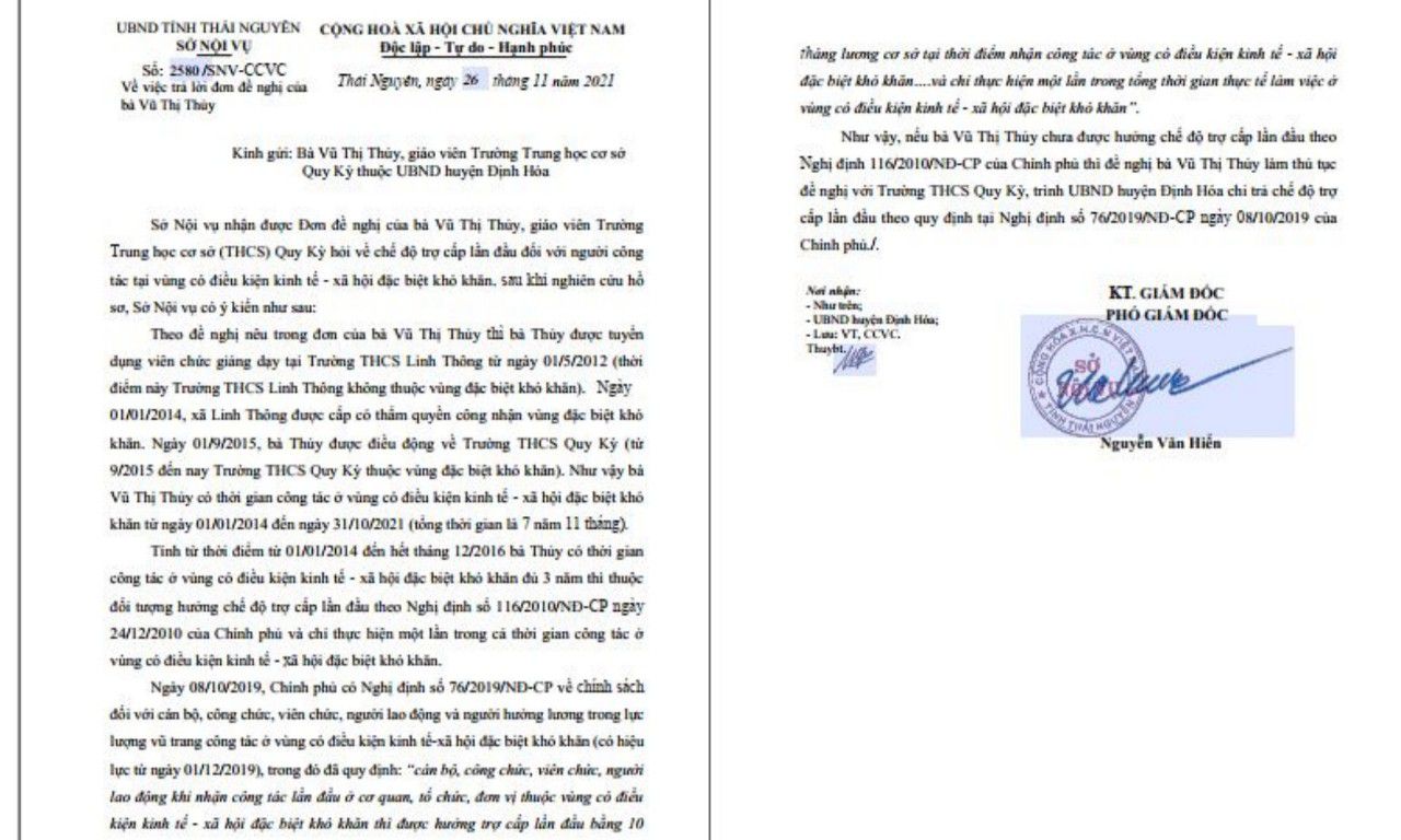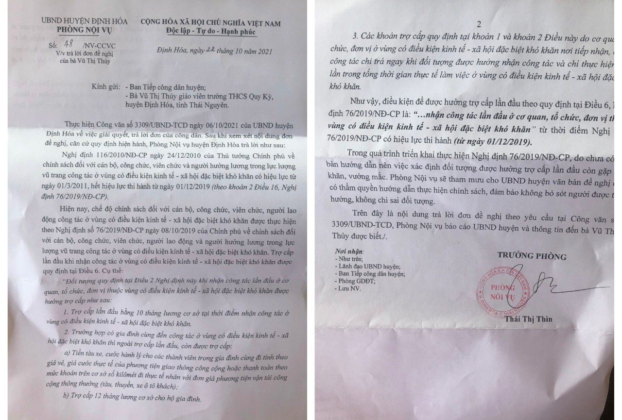Không đồng ý với câu trả lời từ trưởng phòng GD&ĐT huyện Định Hoá, chị Thuỷ tiếp tục làm đơn gửi đến phòng Nội vụ huyện Định Hoá. Ngày 22/10/2021, phòng Nội vụ huyện Định Hoá đã có văn bản số 48/NV-CCVC về việc trả lời đề nghị của chị Vũ Thị Thuỷ, trong văn bản nêu rõ: Trong quá trình triển khai thực hiện Nghị định số 76/2019/NĐ-CP, do chưa có văn bản hướng dẫn nên việc xác định đối tượng được hưởng trợ cấp lần đầu còn gặp khó khăn, vướng mắc. Phòng Nội vụ sẽ tham mưu cho UBND huyện văn bản đề nghị cấp có thẩm quyền thực hiện chính sách, bảo đảm không bỏ sót người được thụ hưởng, không chi sai đối tượng.