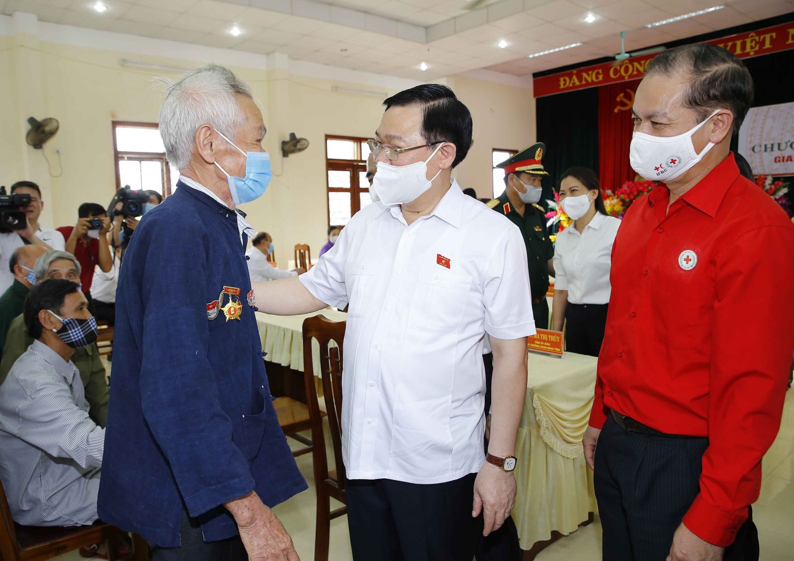 Ủy viên Bộ Chính trị, Chủ tịch Quốc hội Vương Đình Huệ thăm hỏi các đối tượng chính sách tại huyện Sơn Dương, tỉnh Tuyên Quang - Ảnh: TTXVN