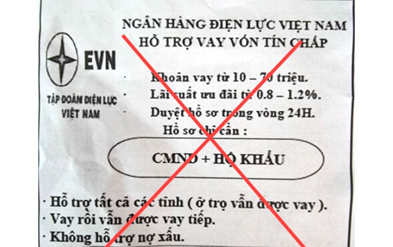 Thời gian gần đây, trên địa bàn TP HCM và một số tỉnh, thành phố khu vực phía Nam xuất hiện các tờ rơi đăng tải thông tin hỗ trợ vay tín chấp dưới dạng giả mạo và lợi dụng hình ảnh, logo và tên của Tập đoàn Điện lực Việt Nam (EVN).
