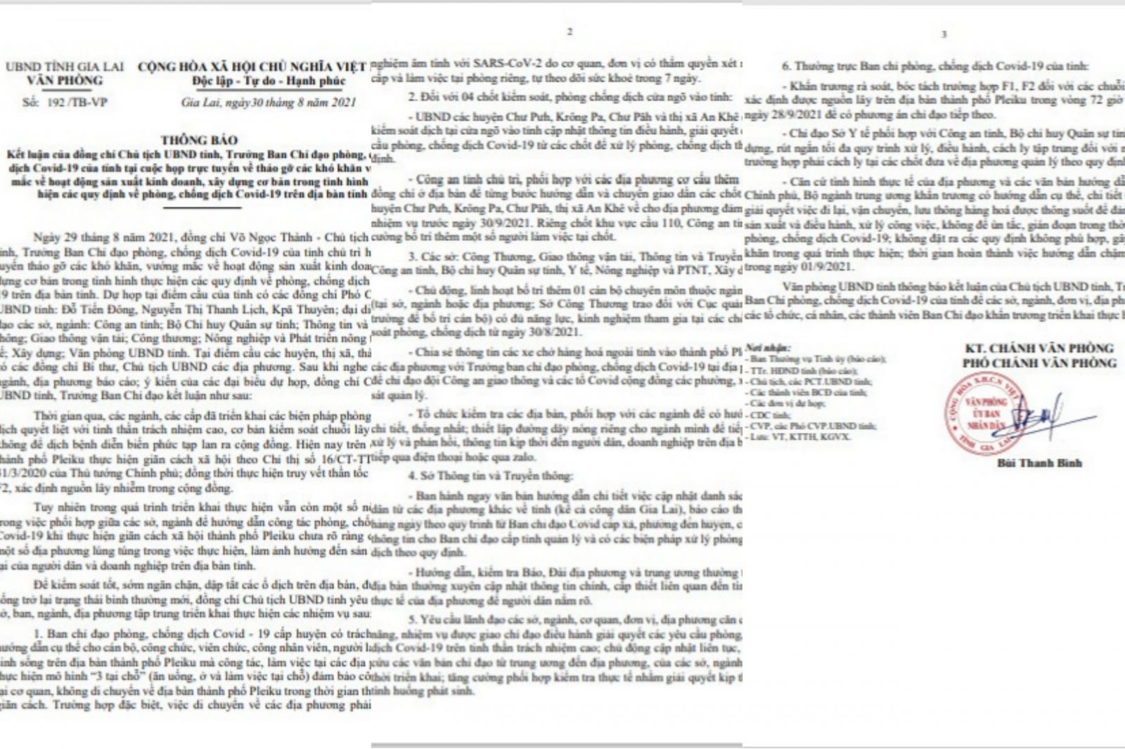 Văn phòng UBND tỉnh Gia Lai vừa thông báo Kết luận của Chủ tịch UBND tỉnh, Trưởng Ban Chỉ đạo phòng, chống dịch Covid-19 của tỉnh tại cuộc họp trực tuyến về tháo gỡ các khó khăn vướng mắc về hoạt động sản xuất kinh doanh, xây dựng cơ bản trong tình hình thực hiện các quy định về phòng, chống dịch Covid-19 trên địa bàn tỉnh.
