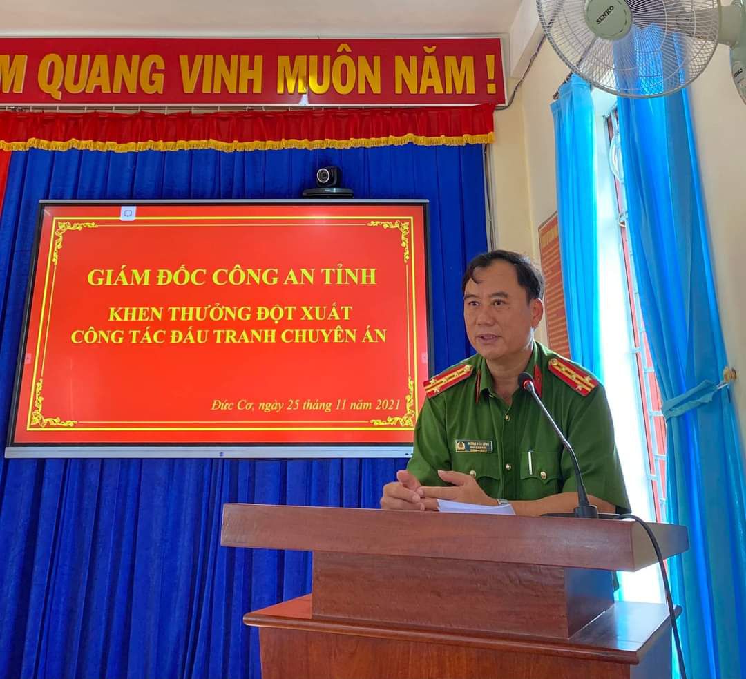 Để kịp thời động viên Công an huyện Đức Cơ trong việc phá thành công Chuyên án, sáng 25-11, Đại tá Dương Văn Long - Phó Giám đốc, Thủ trưởng cơ quan Cảnh sát điều tra Công an tỉnh - đã đến thưởng nóng cho tập thể Công an huyện Đức Cơ.