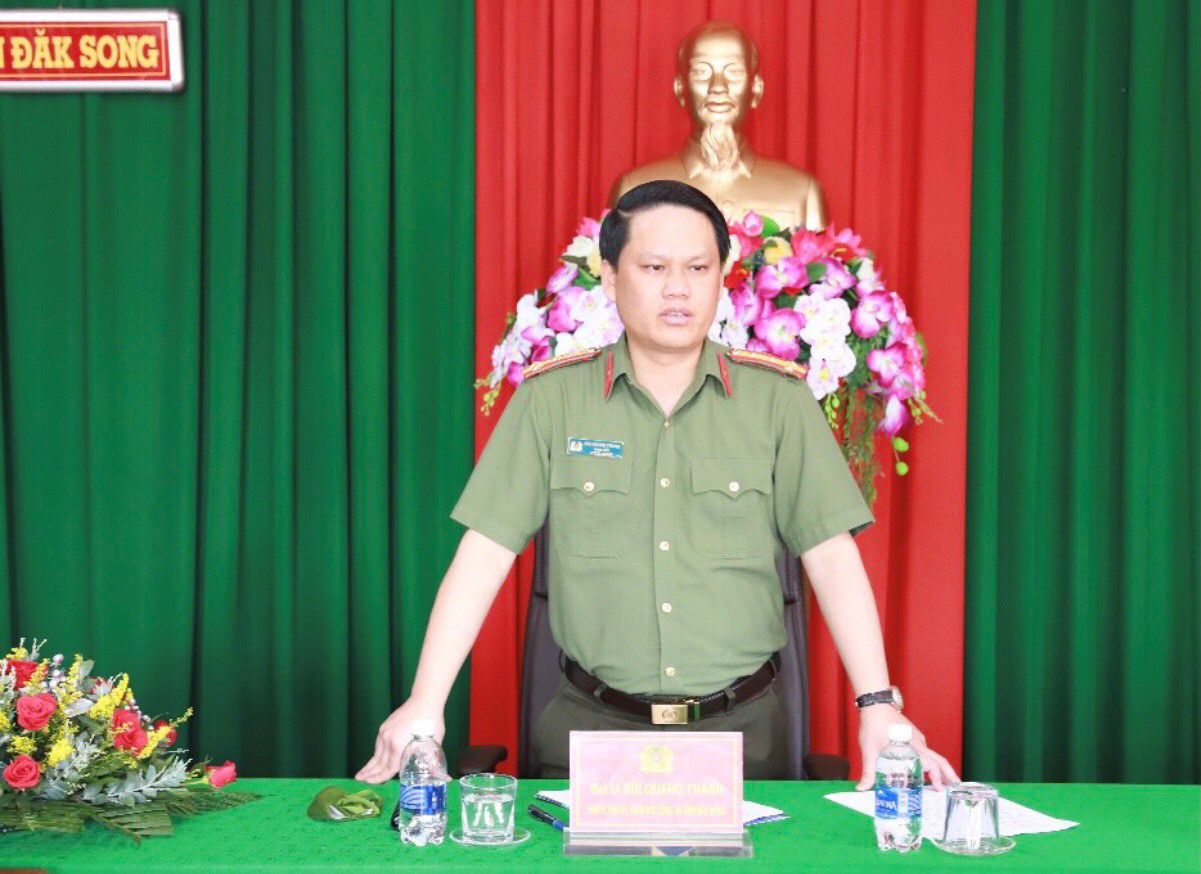 Ngày 1/9/2021, Đại tá Bùi Quang Thanh, Ủy viên Ban Thường vụ Tỉnh ủy, Bí thư Đảng ủy, Giám đốc Công an tỉnh Đắk Nông đã làm việc với Công an huyện biên giới Đắk Song về các mặt công tác Công an trong 9 tháng đầu năm 2021. Tham gia buổi làm việc có lãnh đạo một số phòng nghiệp vụ Công an tỉnh và lãnh đạo chủ chốt của Công an huyện Đắk Song.