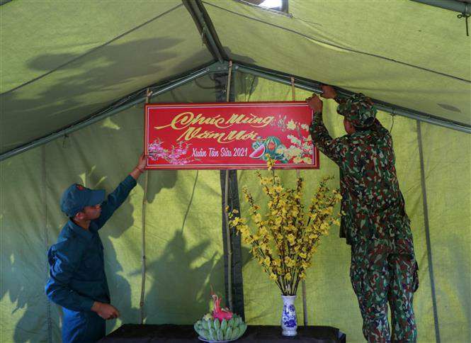 Tại các lán trại, chốt tạm của biên phòng đều được trang trí mâm ngũ quả, ảnh Bác Hồ, hoa mai... mang đầy đủ hương vị ngày Tết cổ truyền của dân tộc. Những chiếc bánh chưng được luộc nhiều lần trong các nồi nhỏ, vớt ra ráo nước, được các anh chọn những cái đẹp nhất mang lên bàn trưng bày. Mâm ngũ quả đã chuẩn bị xong còn tươi màu để kính dâng trước di ảnh Bác. Bên cạnh, bình hoa mai cũng được các anh cắt tỉa gọn gàng, mang sắc Xuân ấm áp về trên các Chốt.