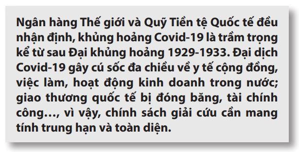 Ngân hàng Thế giới và Quỹ Tiền tệ Quốc tế đều nhận định khủng hoảng Covid-19 là trầm trọng kể từ sau Đại Khủng hoảng 1929-1933. Covid-19 gây cú sốc đa chiều về y tế cộng đồng, việc làm, hoạt động kinh doanh trong nước; giao thương quốc tế bị đóng băng, tài chính công… Cho nên, chính sách giải cứu tại Việt Nam cần mang tính trung hạn và toàn diện.